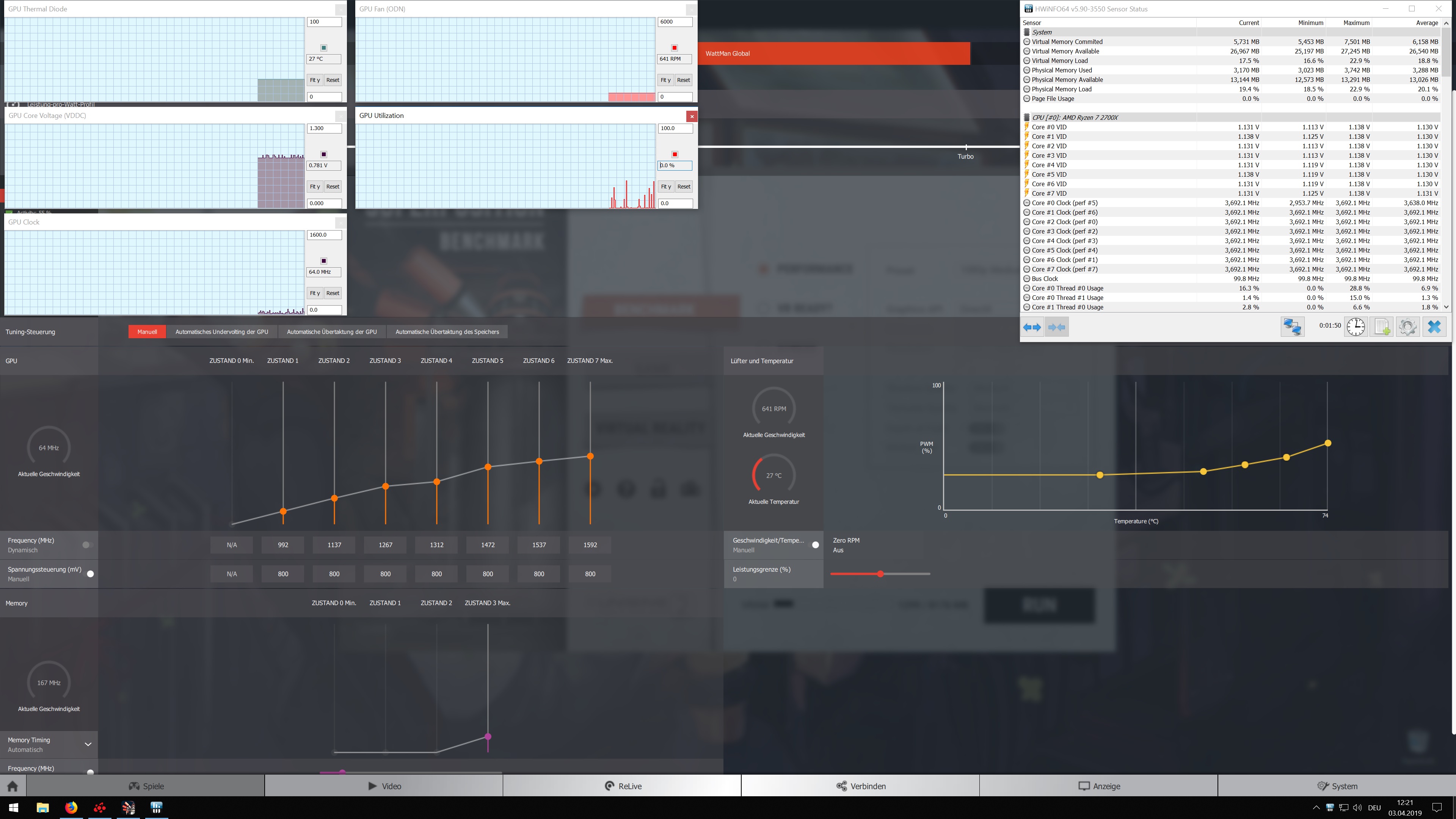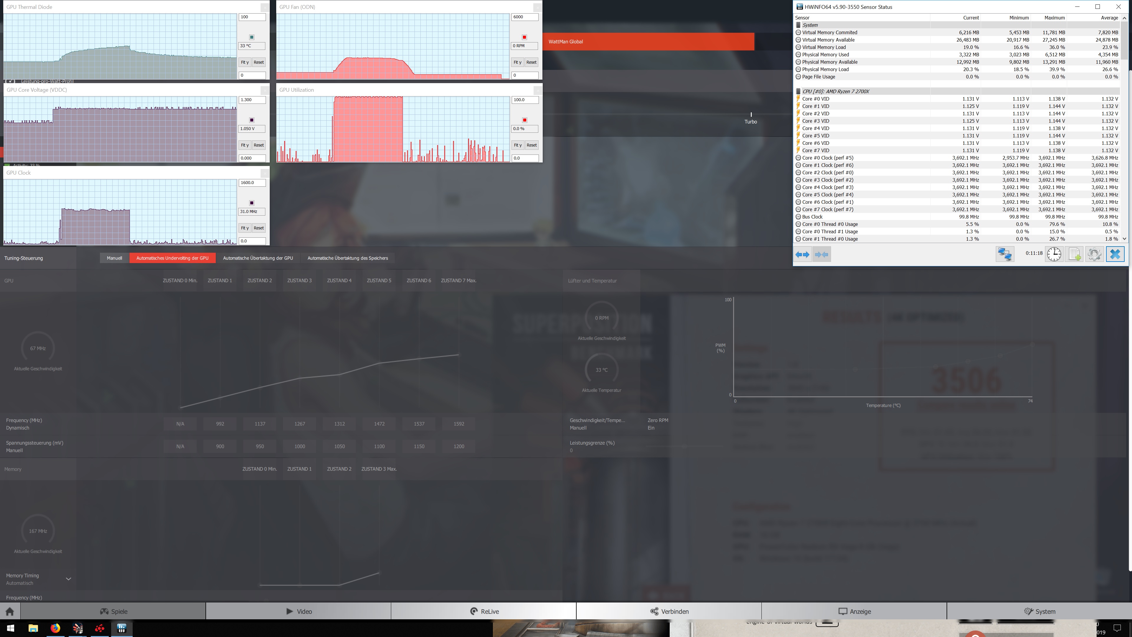 Hier Bilder vom Wattman zusammen mit HWInfo64. Dazu möchte ich anmerken dass beim ersten Bild Idle 800 mV davor automatisches Undervolting aktiv war und der Vcore von dort auch auf den Bildern zu sehen ist. Erst wenn ich irgend ein 3d Spiel oder Benchmark aufrufe ändern sich auch tatsächlich die Werte laut HWinfo. Aber auch die Ingame Performance ist spürbar schlechter mit manuellem Undervolt egal auf was und Temps sind auch höher.