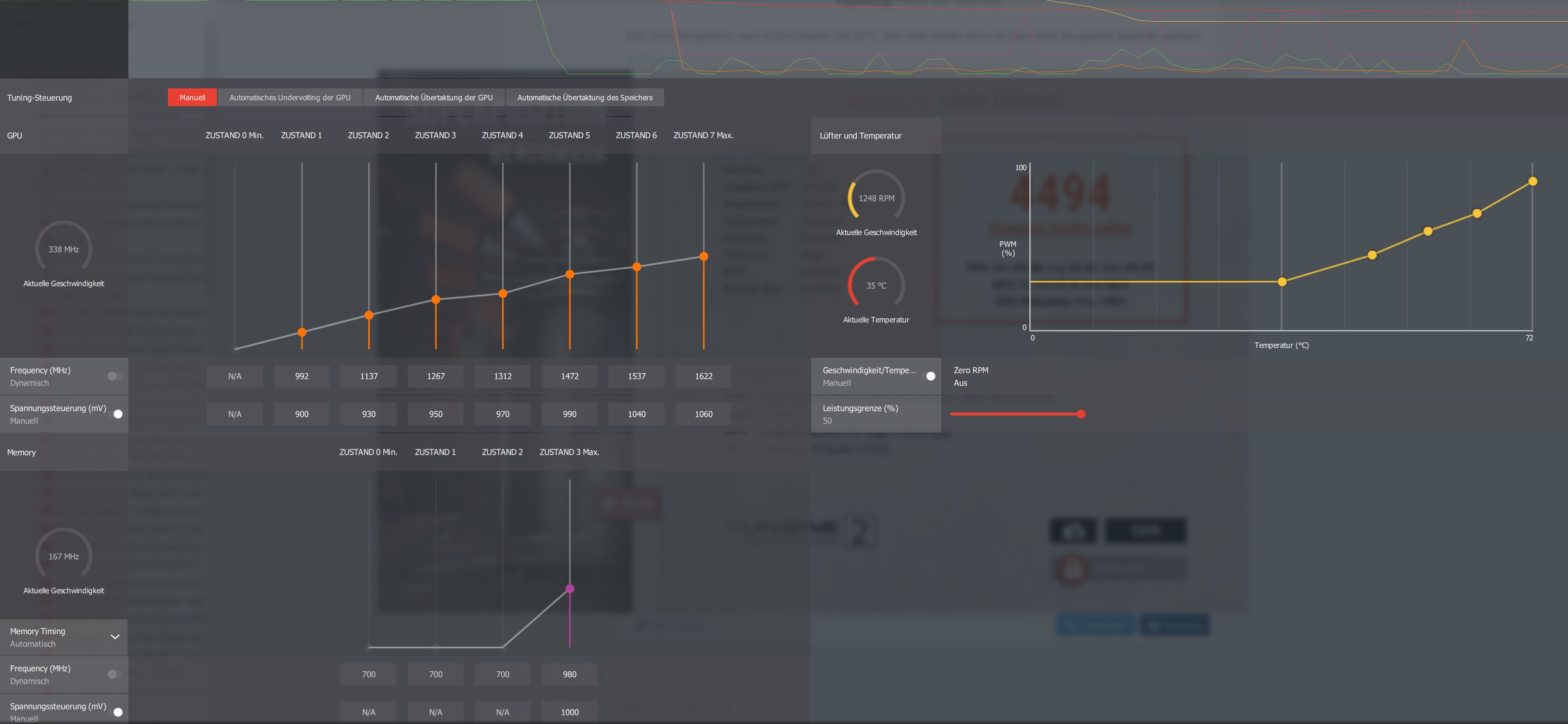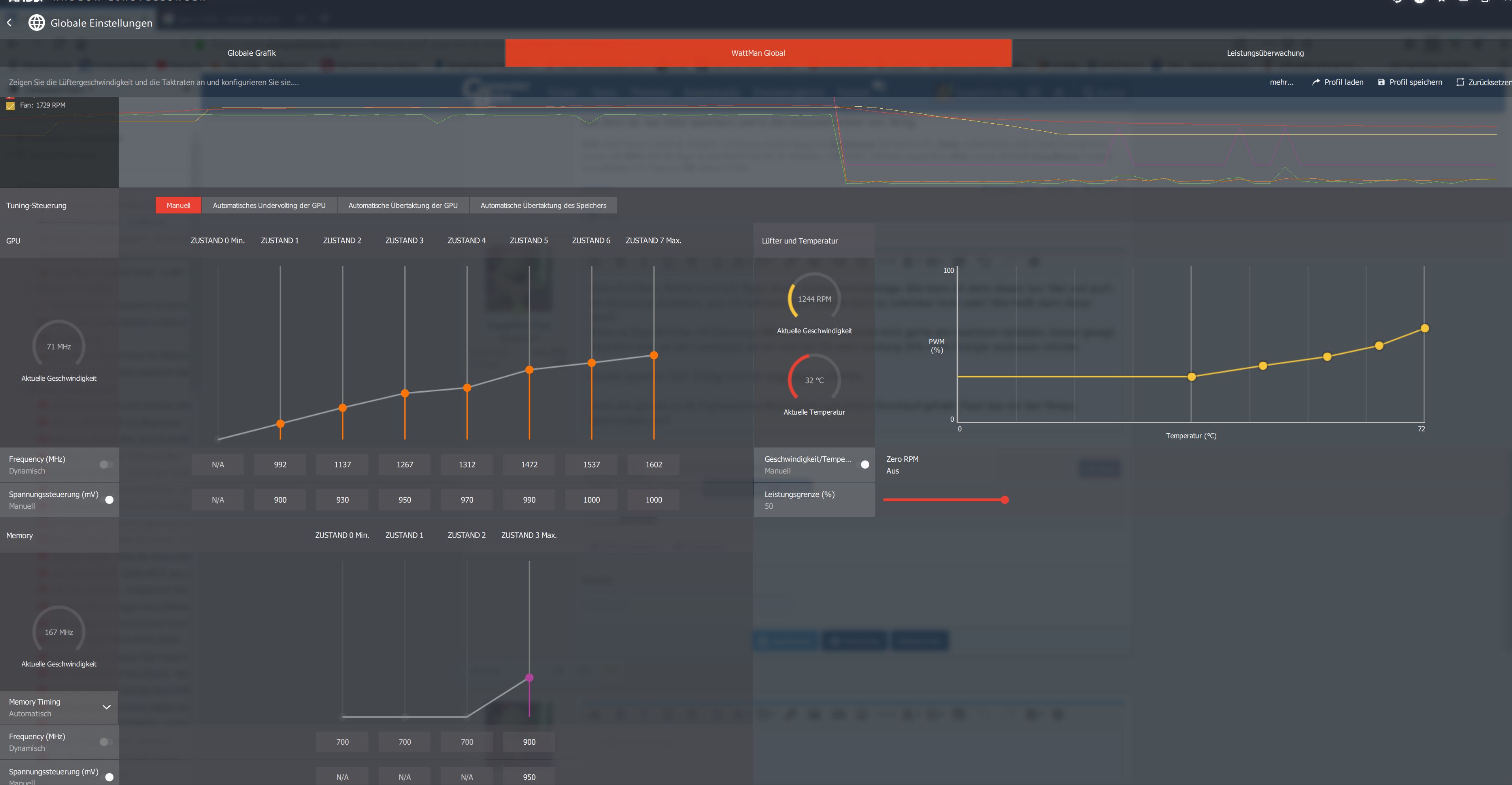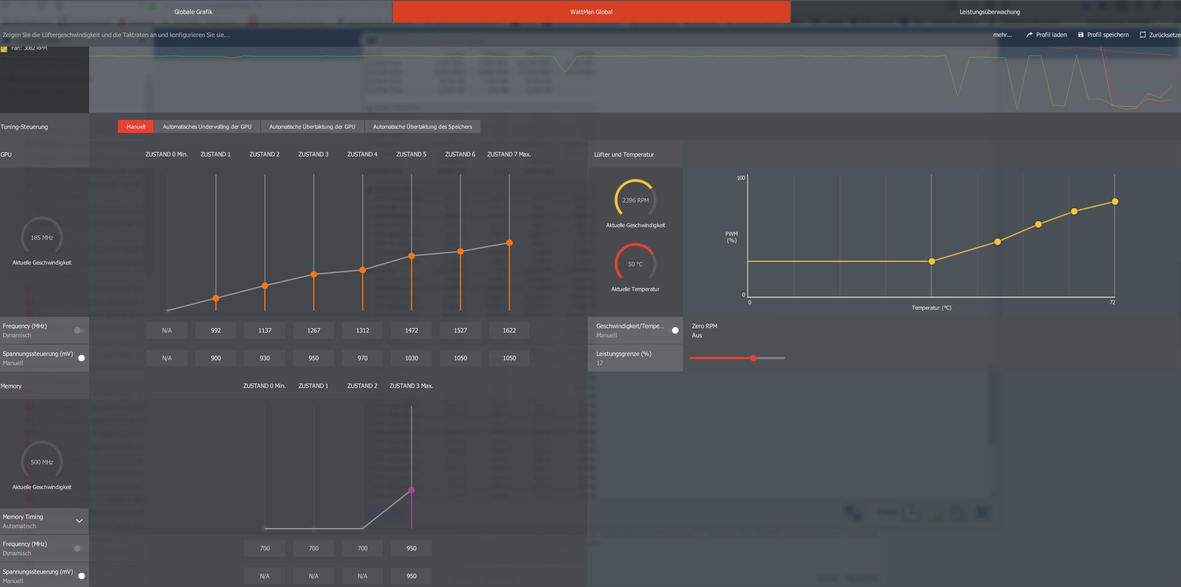 Was ist von diesen Temps zu halten? Noch im grünen Bereich? War im Superposition Benchmark 1080p extreme bei 4494 Punkten, im ausgewogenen Standard-Profil waren es 4001. das ist eine Steigerung von pi mal Daumen 12%. Ist doch recht ordentlich oder?Das waren die Wattman-Einstellungen: Siehe Screenshot.