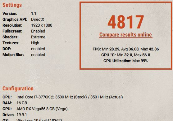 4817 habe es grad mal mit meinen "höheren" Einstellungen durchlaufen lassen auf 1080P Extreme. Nicht wirklich hohe Werte. Er hat meine Vega64 (das hätte ich wohl erwähnen sollen da ich grad sehe das du eine 56 hast) als 56 erkannt . Das ist leider auch das schwierige im Forum mal "schnell" Werte zu suchen. Manche haben die 56, manche 64, manche LC bios, manche das, manche eine Top Karte während ich eine Stock 64 mit Morpheus Umbau habe.