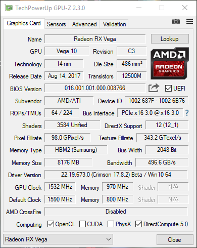 Eine neue GPU-Z Version (2.3.0) mit Vega Support ist heute released worden. Unterstützt wird nun das korrekte Auslesen aller Sensordaten und das komplette Dumpen des Bios. Auch der VRAM Hersteller wird nun richtig ermittelt.