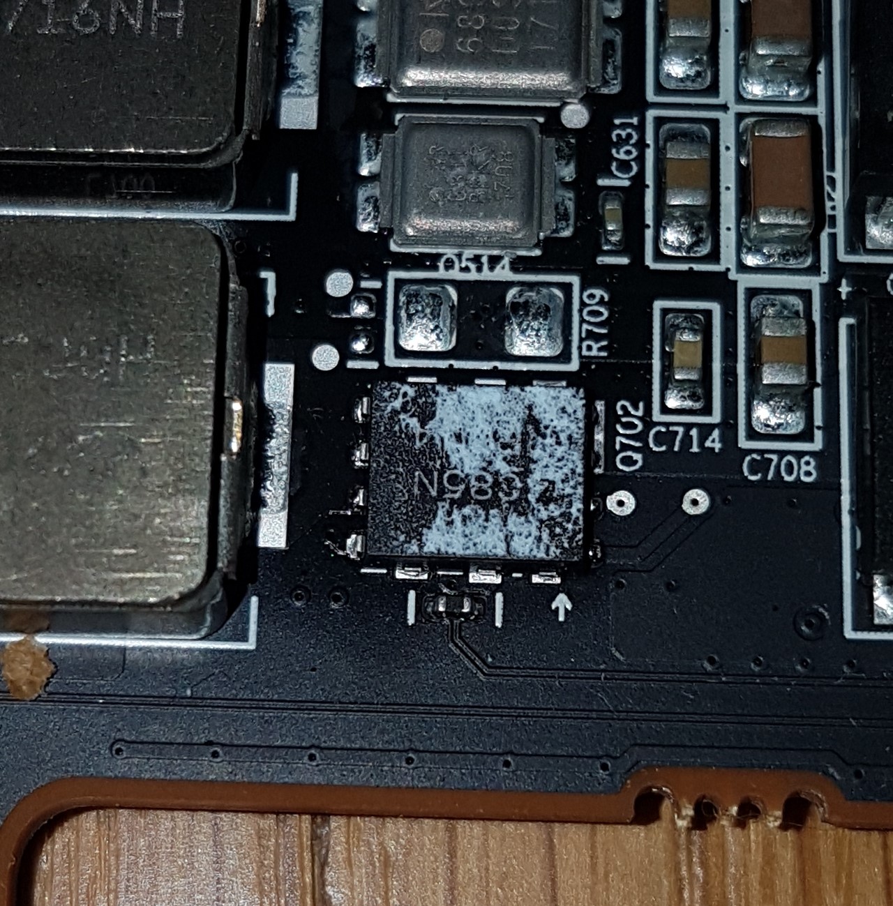 Leider scheint es nicht so einfach zu sein, die Kühlung zu optimieren, ich habe einfach mal auf der Printrückseite Wärmeleitpads angebracht, welche die Printrückseite mit der Backplate thermisch verbinden sollen um die Kühlung etwas zu verbessern. Ob das was nützt werden wir ja sehen. Das Gehäuse der FETs ist auf Kühlung über die Leiterplatte ausgelegt und nicht über einen Kühlkörper der auf dem Gehäuse aufliegt. Leider gibt es nicht allzuviele Vias in diesem Bereich. Ausser es wurden evtl Thermalvias verwendet in Form von gedeckten Vias.
