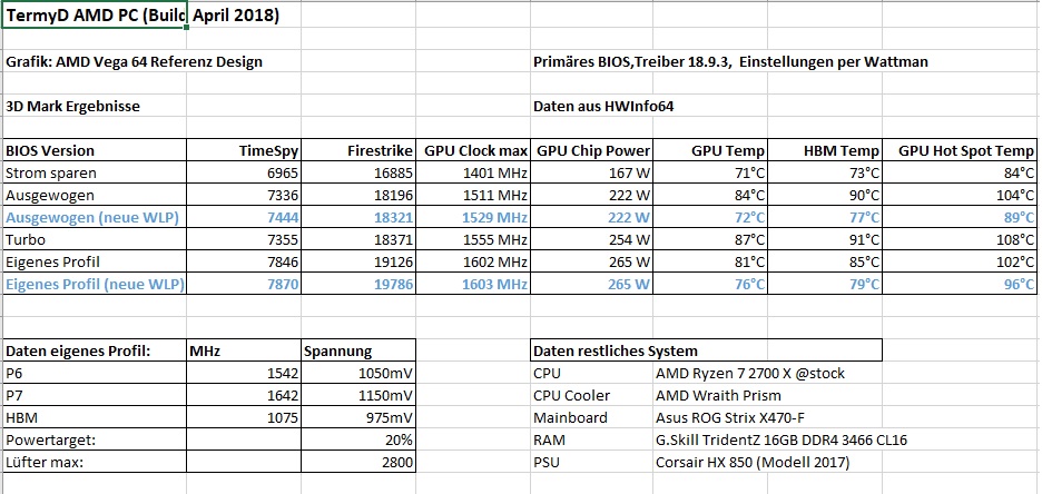 Dazu habe ich erst eine Runde 3D Mark Benchmarks auf den Wattman Profilen "Strom sparen", "Ausgewogen", "Turbo" und mit einem "Eigenem Profil" durchgeführt. Die Ergebnisse zu den GPU, HBM und Hotspot Temperaturen sowie einiger weiterer Angaben habe ich mit HWInfo64 protokolliert.