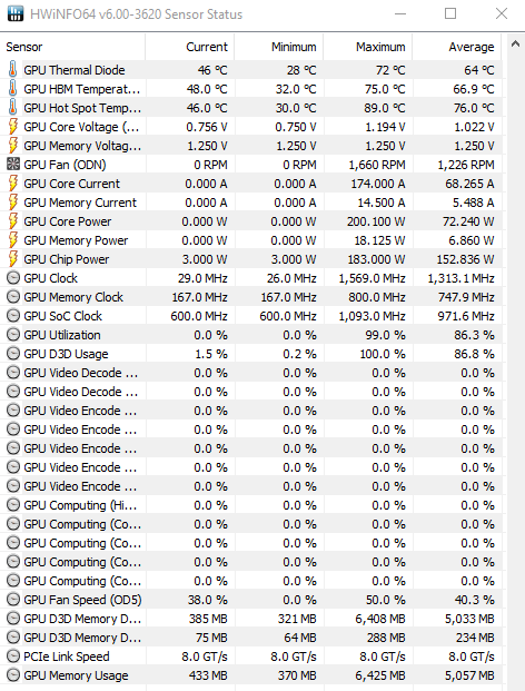 Temperatur lag bei knapp 80° beim Hotspot und um die 65° auf der GPU. Ich hatte das Temperaturtarget aber auch bei 66° eingestellt, das noch mit Luftkühlung.