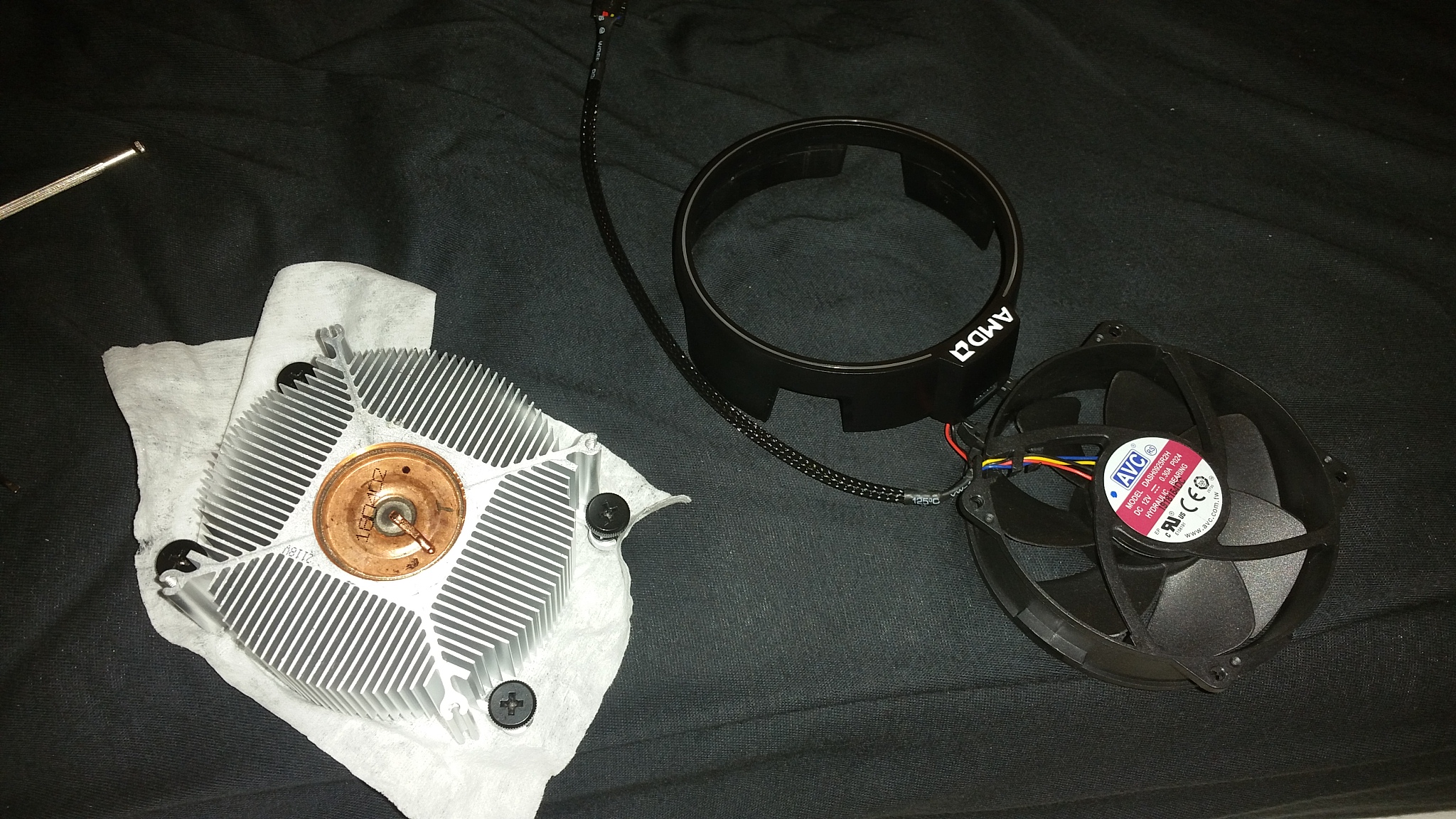 Noch ein Tipp für andere, dieser Wraith Boxed Kühler hat die Lüfterschrauben in 70mm Abstand. Ich hatte auch noch nen Trichter-Adapter in der berühmten Kiste, eigentlich von 70/80mm auf 92mm. Also Trichter mit den Originalschrauben über 70mm Löcher auf den Kühler geschraubt. Vorhandene Silikon Entkoppelungsnupsis (lange elastische Stifte) in die 80mm Löcher neben den 70mm gepfriemelt. Dann kann der Lüfter in die Trichteröffnung gesteckt werden, und man fummelt dann einen der Wabbel-Stifte nach dem anderen durch die Schraubenlöcher vom 80mm Lüfter. Zum Glück ist mir diesmal kein Stift gerissen.