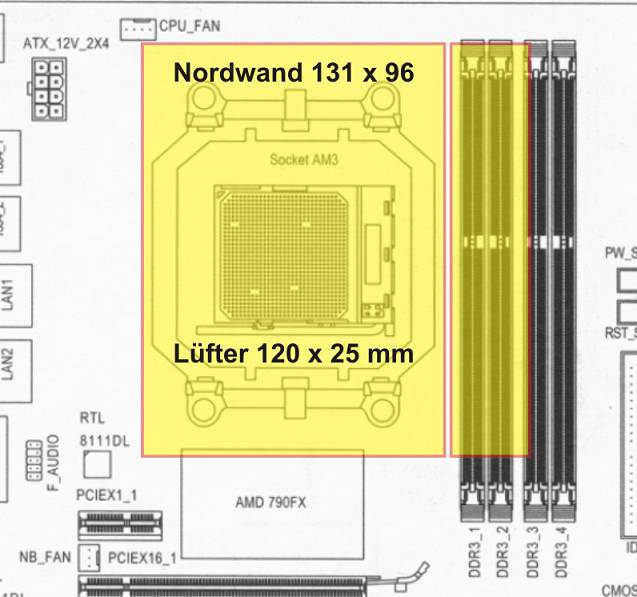 Der Nordwand-Kühler mit den Maßen 131 x 96 mm, der Kühler mit 120 x 25 und der Abstand zwischen Kühler und Lüfter von ein paar Millimeter ergibt eine Breite von ~ 125 mm und damit werden zwei RAM-Slots eines AM3-Boards mit Referenzlayout überbaut.