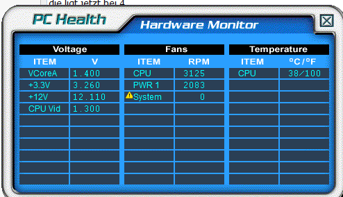 Edit2: Ist doch etwas seltsam. Was macht denn der zweite Kern da so ? 38°C + Raumtemperatur = ~60-65 °C. Das ist schon zuviel für idle. oder meintest du mit zweiter Kern vielleicht die CPU-Temperatur. Schau doch nochmal mit Everest nach, was da unter 1. Kern, 2. Kern und CPU steht.