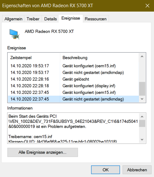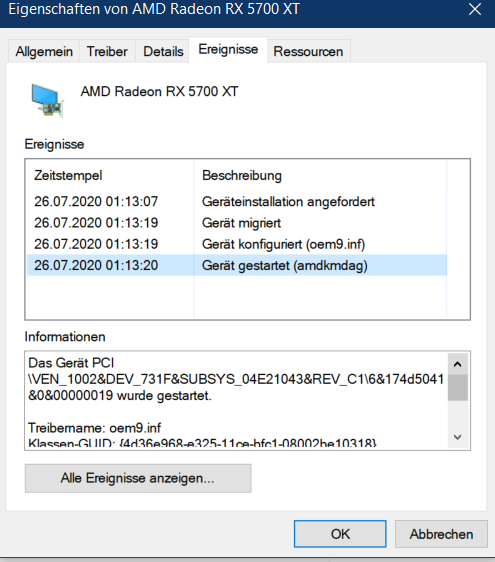 bei meinem Problem, das mein PC nicht automatisch von Windows nach Energiesparplan in den StandBy versetzt wird, ist mir aufgefallen dass die Datei "amdkmdap" im Gerätemanager in den Eigenschaften meiner Radeon RX5700 XT, nicht gestartet werden kann.