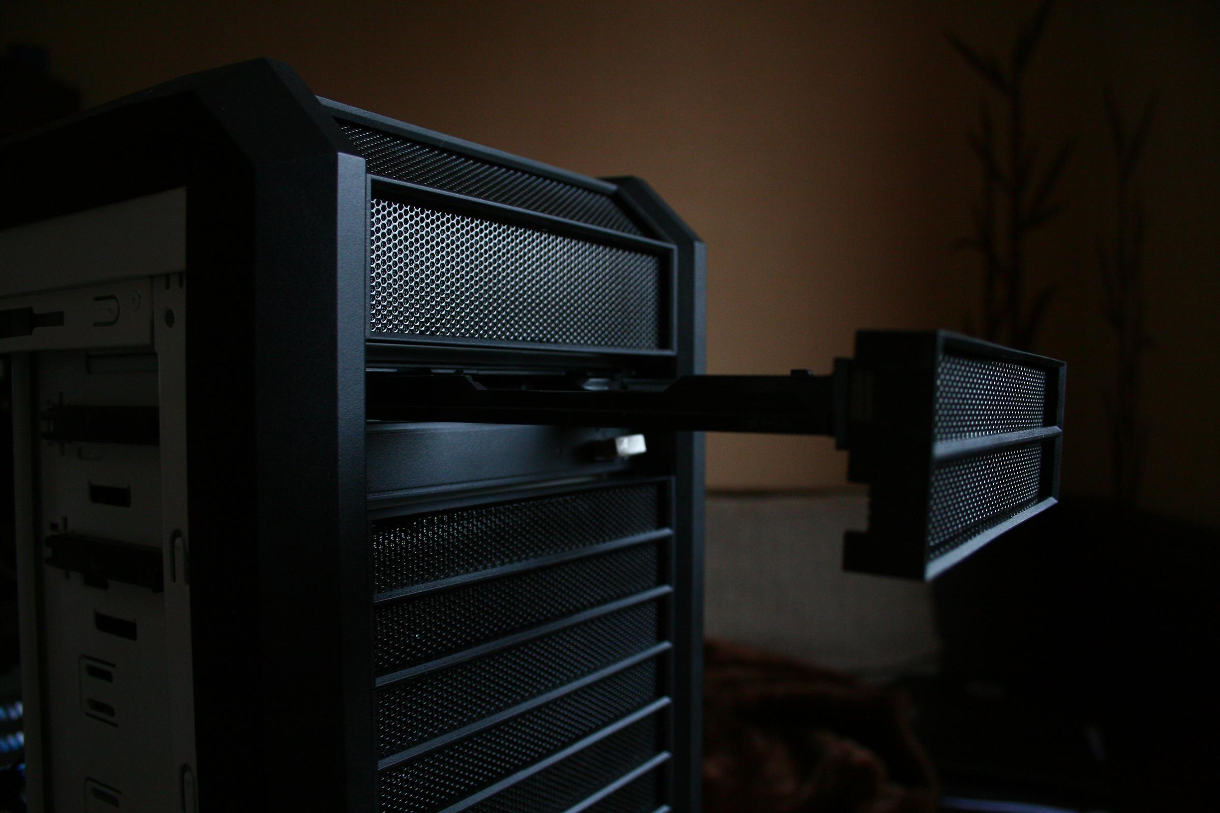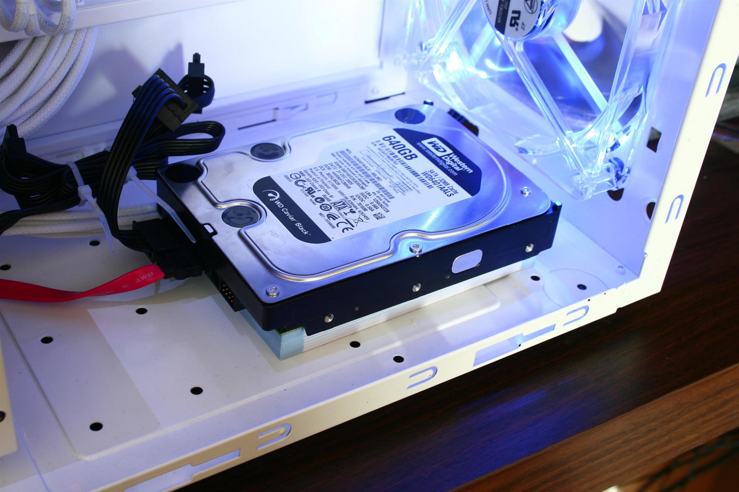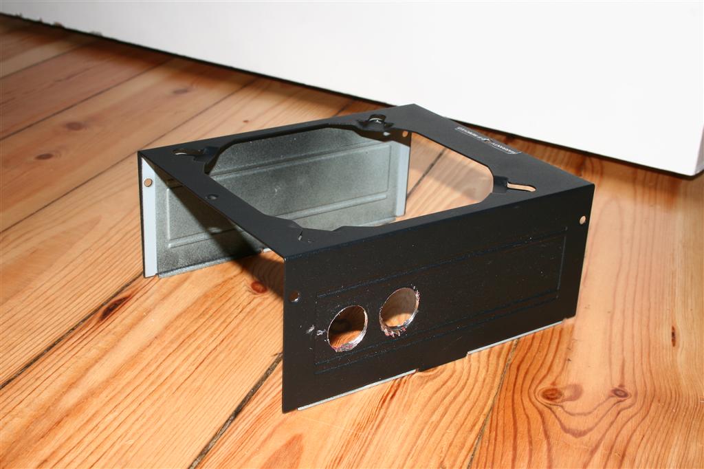 Der HDD Käfig wird entfernt und die Festplatte wird in ein Entkoppler gepackt, dessen Marke ich mir aber noch unschlüssig bin.