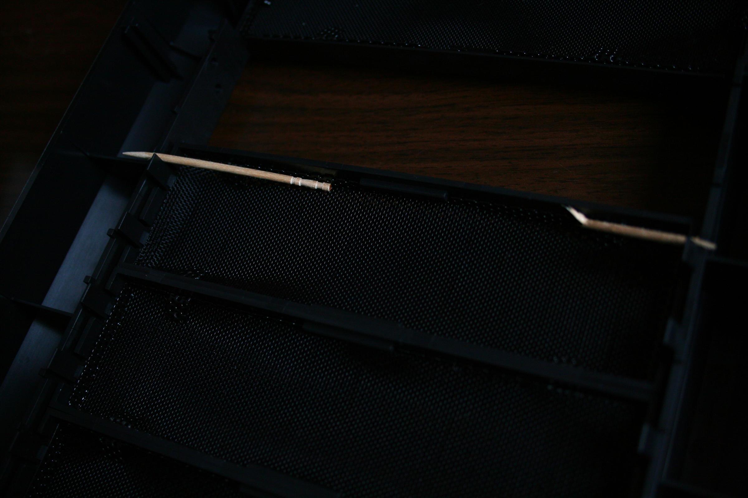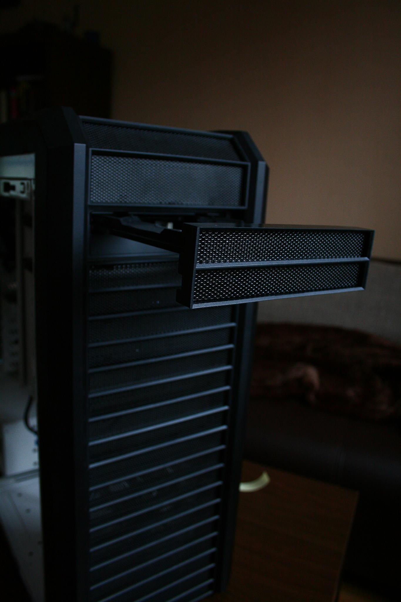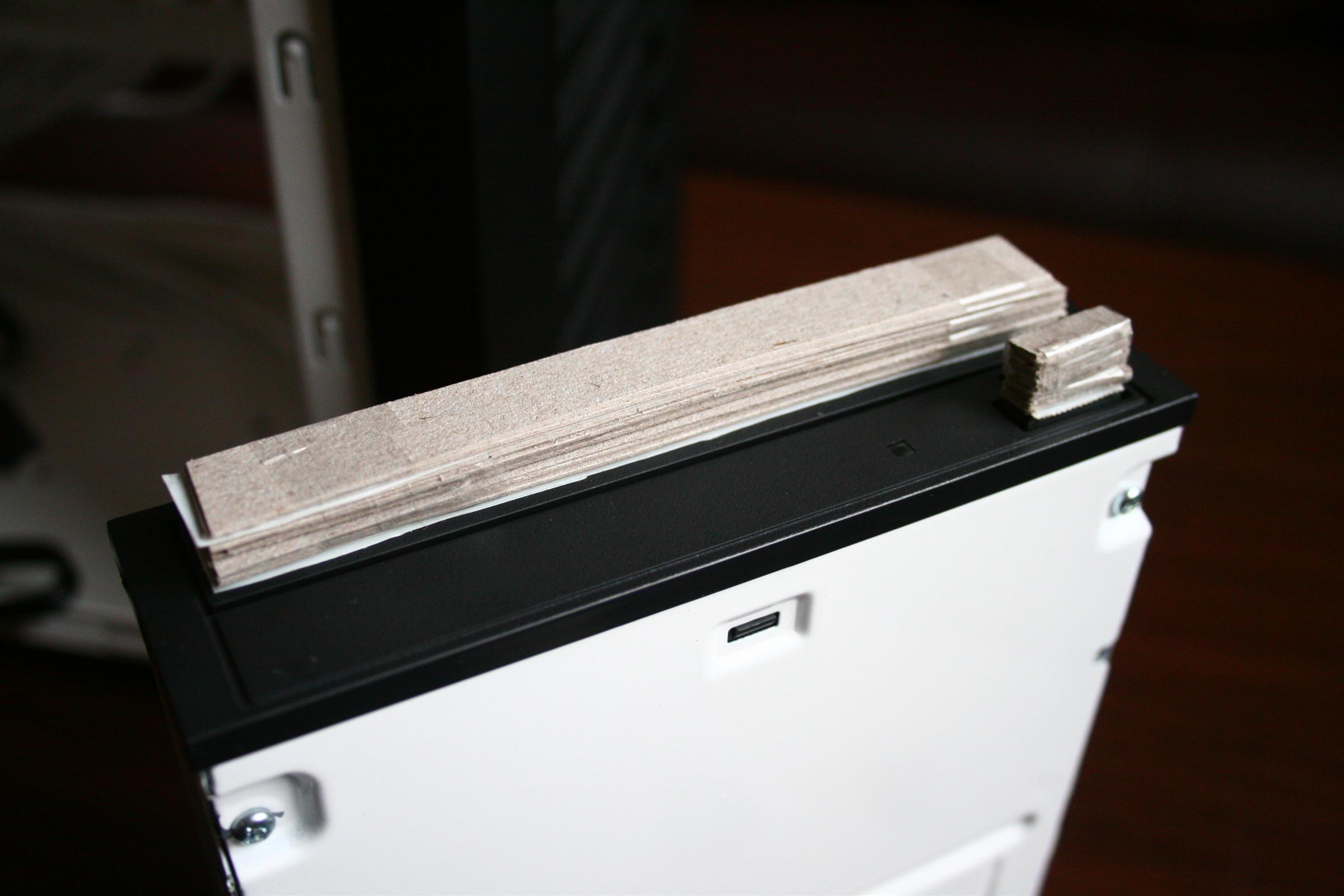 Der HDD Käfig wird entfernt und die Festplatte wird in ein Entkoppler gepackt, dessen Marke ich mir aber noch unschlüssig bin.