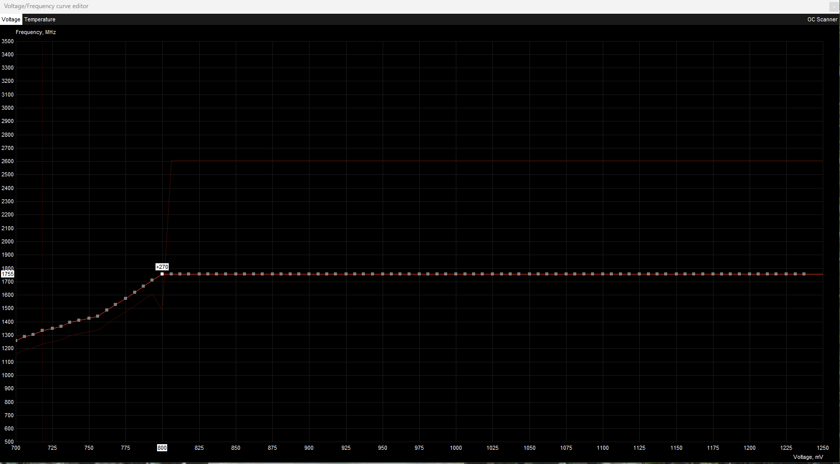 Unter 1485(+30MHz boost) komme ich ohne das locken mit L nicht und es bleibt rechts ein Teil der Kurve stehen, den ich nicht weg bekomme und der die Spannung immer wieder auf 1000mV zwingt....das ist anscheinend beides von der Grafikkarte vorgegeben.