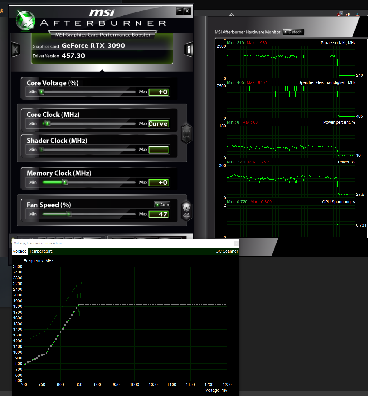 Und ich sollte nicht so hetzen (hat man ja gestern schon gemerkt, hätte erstmal alles lesen sollen, ..sry nochmals...), aber das mit der Lüfterkurve will nicht klappen. Sprich: Ja, ich kriege alle 3 auch im Desktopmodus zum laufen (wie gewünscht), aber der vorderste ruckelt irgendwie). Also dafür EVGAs Precixion X1 genommen und es läuft. Ich hoffe also, dass das EVGA Tool und der Afterburner sich nicht beissen. Kann ich notfalls irgendwie die Lüfterkontrolle vom Afterburner deaktivieren? ..ja, ist doof wenn ich dann zweigleisig fahren muss, ich weiß..