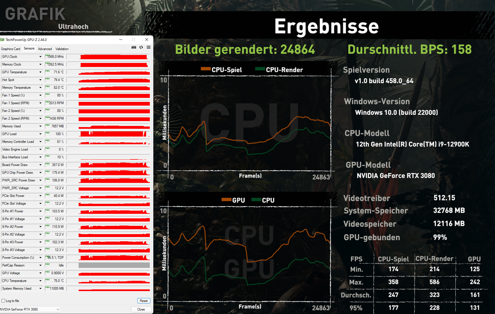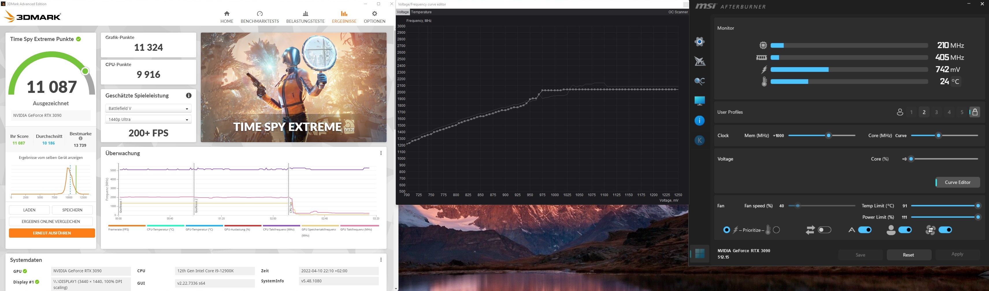 Ich habe mit der 3080 12GB bisschen gespielt und mal 3 Test gemacht wo die Karte am effizientesten laufen könnte. Dazu habe ich eine maximale Referenz festgelegt wie ich die Karte 24/7 betreiben würde , in meinem Fall 0,9V und keine PL-Erhöhung ,also ein 375W Cap wo die Karte auch reinläuft.