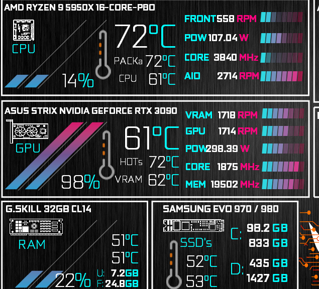 Auf den Heatsinks liegen 2 Noctuhas 120mm mit 900 RPM – 1000RPM. Das Gesamte System ist sehr leise, was man auch an den RPM Werten auf dem Sensorpanel sehen kann.