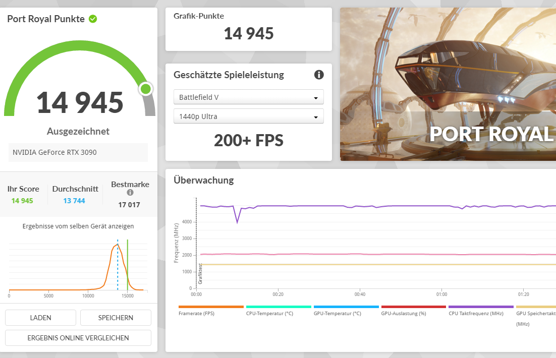Zum Spaß auch mal ein Portroyal 1440P alles auf Maximum fast 15.000 Punkte mit Luftkühlung da war ich selbst überrascht.
