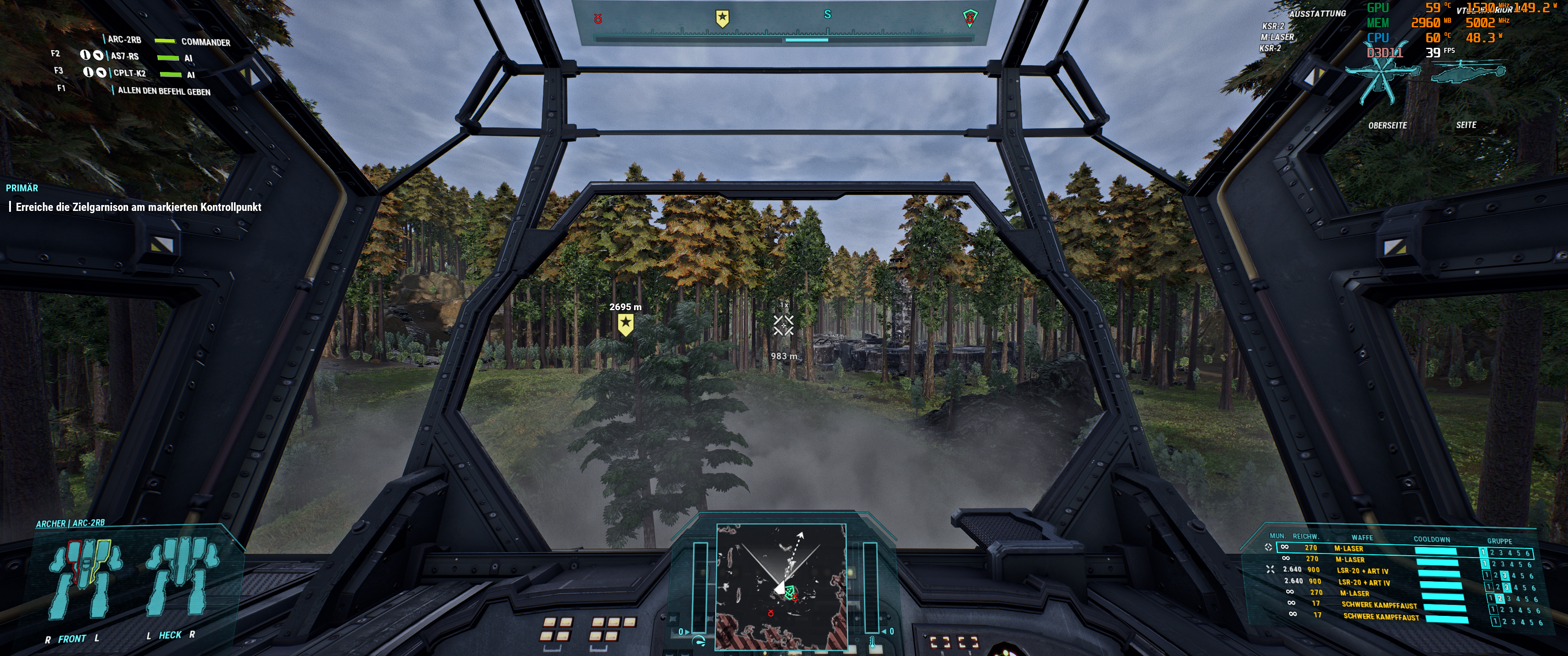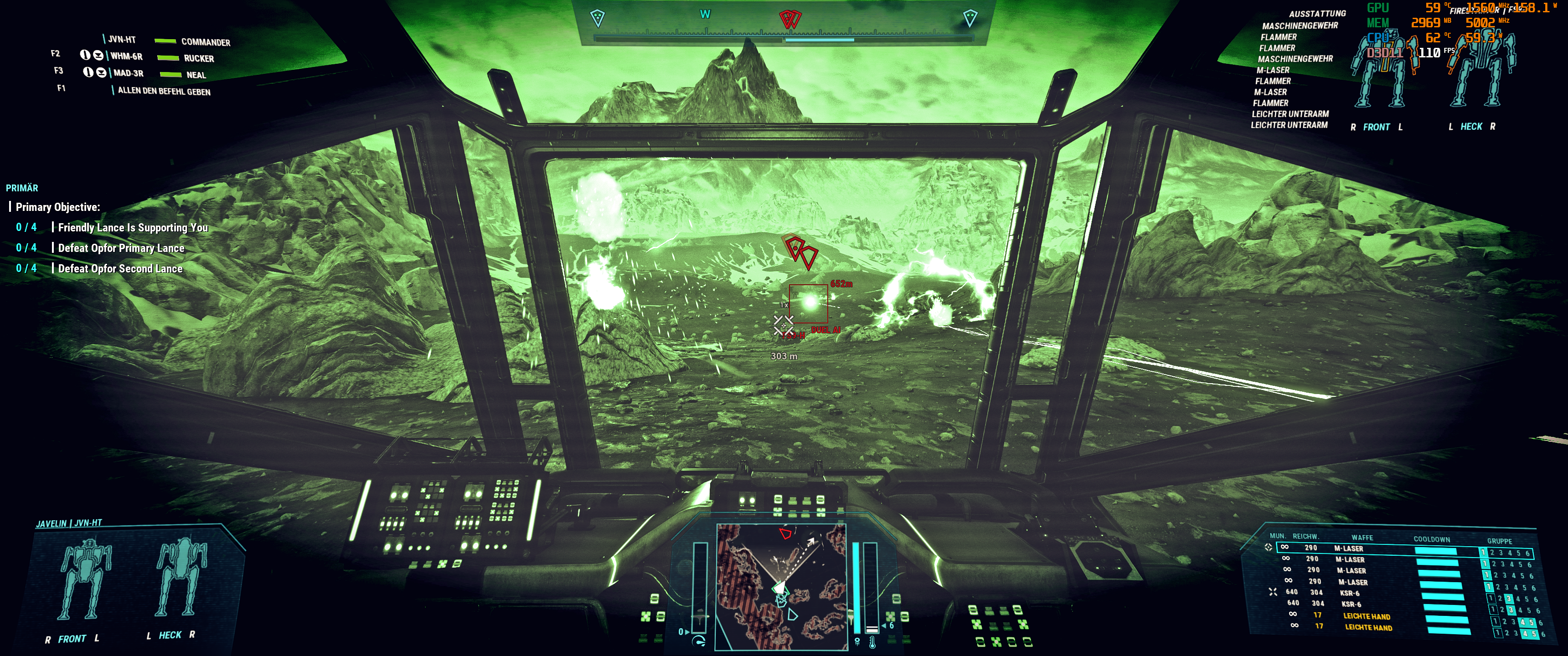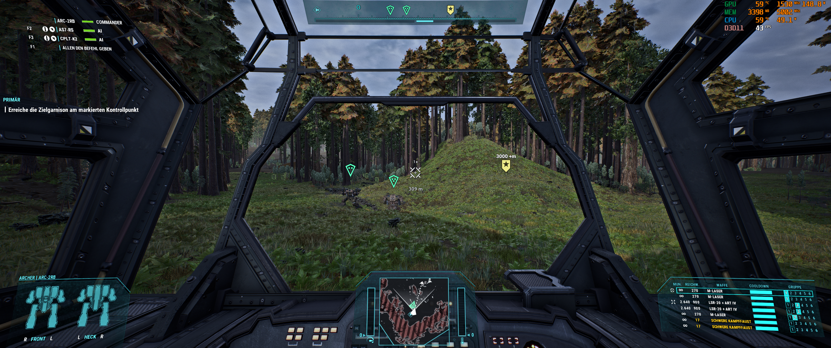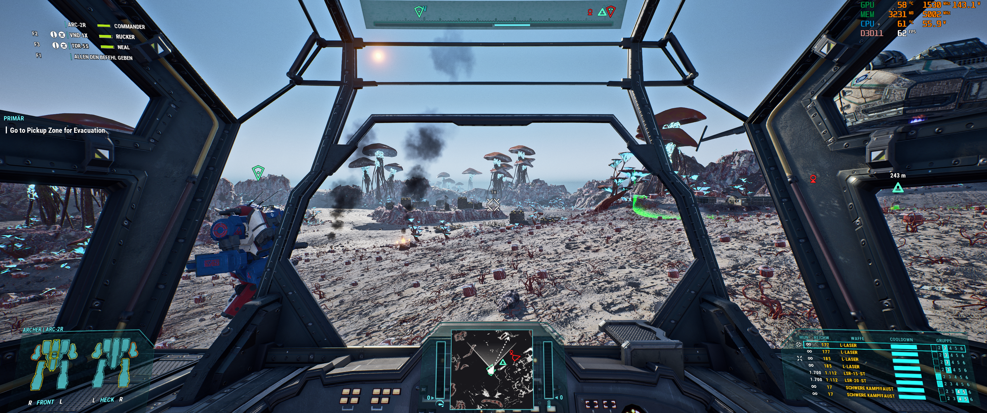 Mal 3 Screenshots von 2 anspruchsvollen MW5 biomen nachgeschoben wo man selbst mit DLSS (Quality) < 60FPS fallen kann. wie man auf den shots erkennen kann, ist jeweils auch nicht beonders viel los, wenn erstmal hunderte vom Raketen durch die Gegend fliegen oder Large Scale Battles im Gange sind, muss GPU-power nachgeschoben werden.