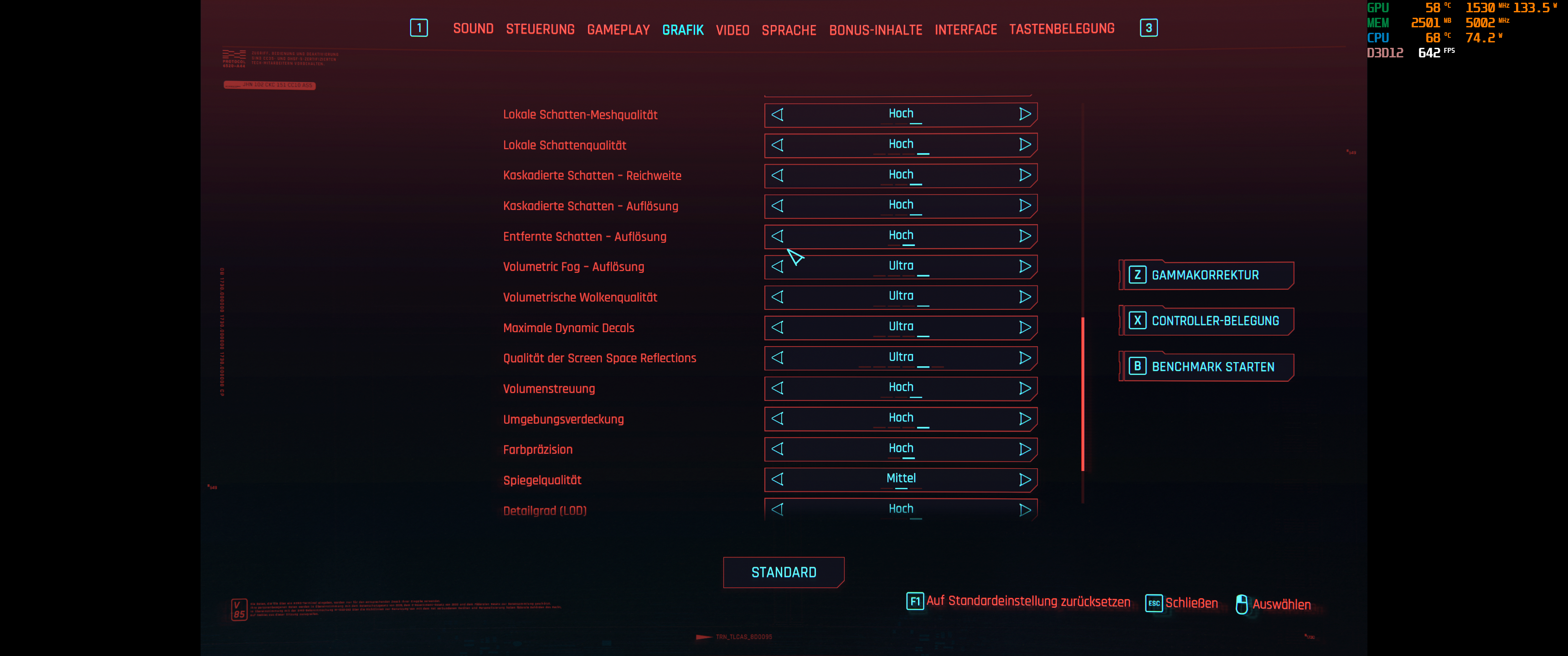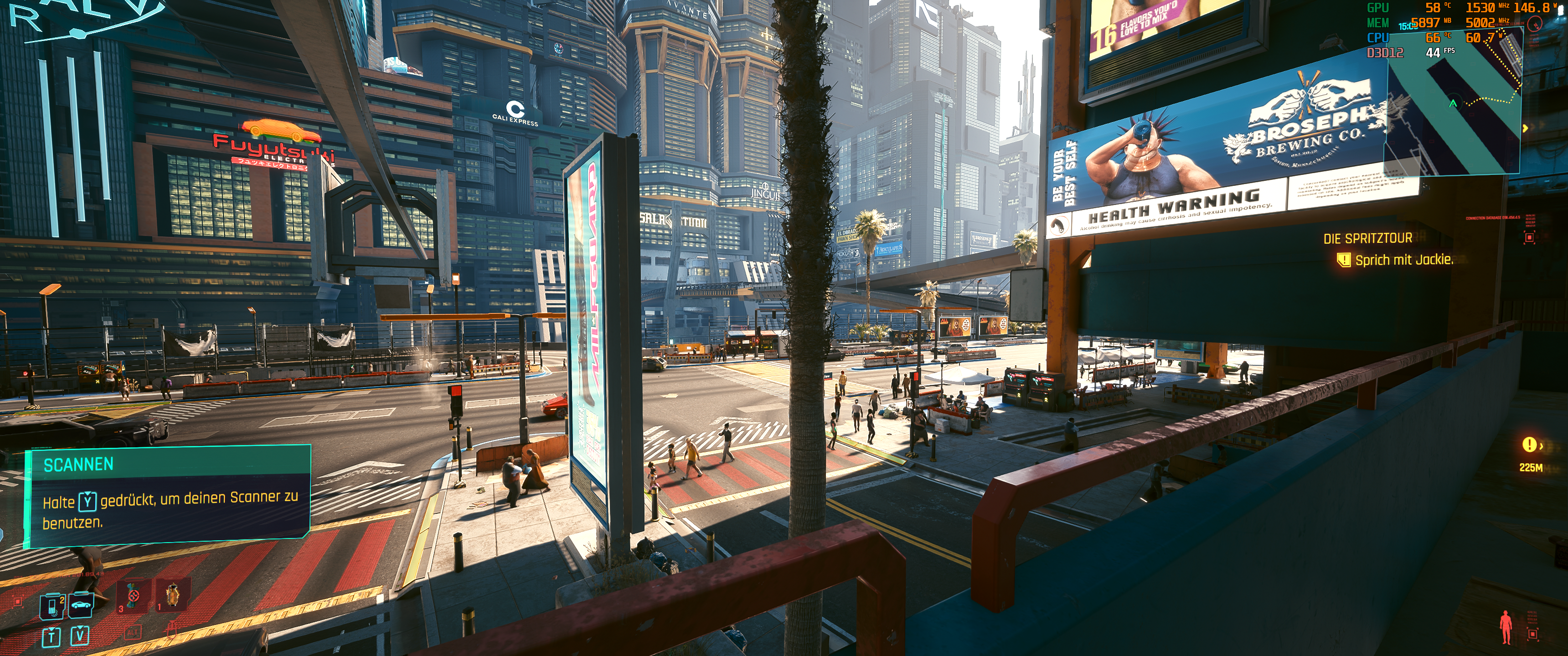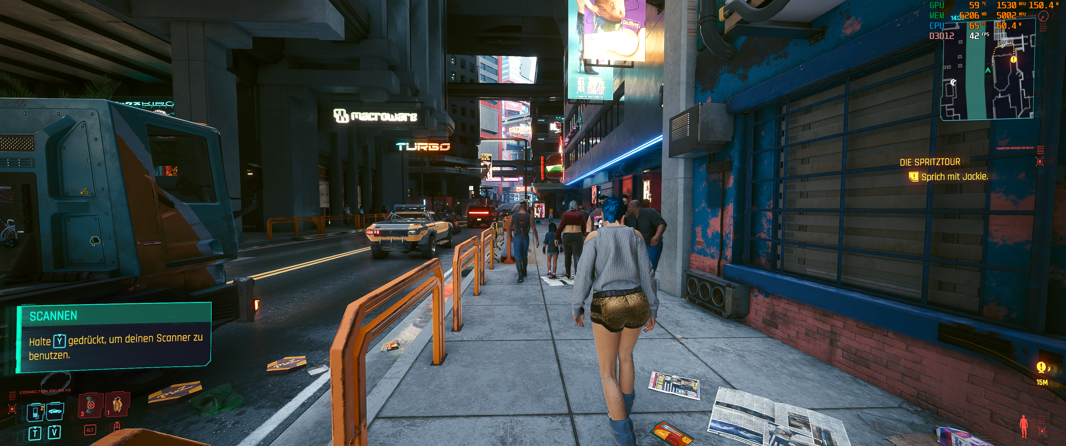 Mal 3 Cyberpunk Screenies nachgeschoben, mit DLSS(+HDR reshade) liegt man bei ca. 40-50 fps, bei weitesgehend Ultra/Hohen Einstelleungen in UWQHD - um sich hier zu steigern muss man ebenfalls deutlich mit WATT nachlegen.