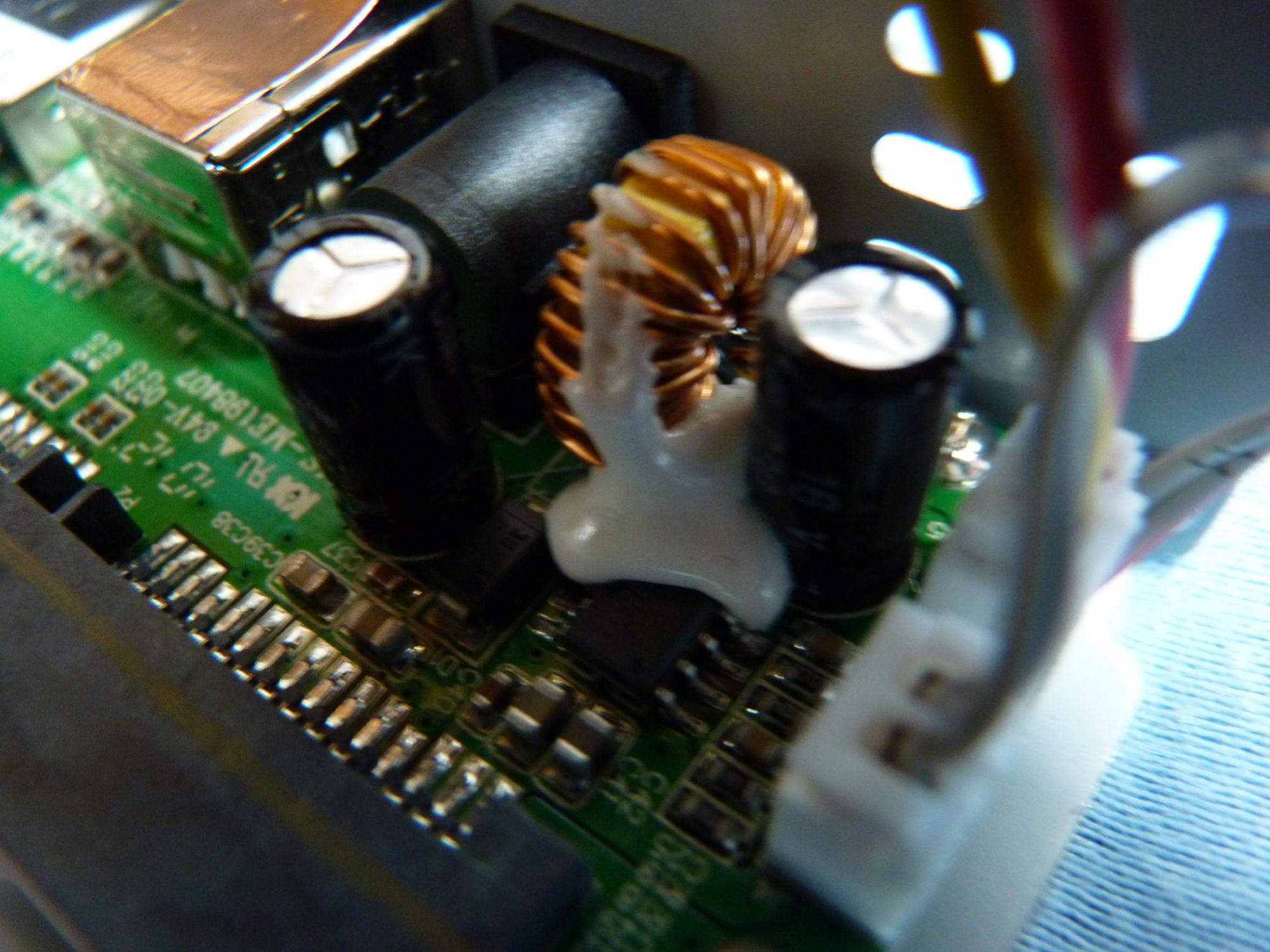 Und zwar funktionierte meine FP (Samsung F3 1 TB) in diesem Gehäuse nicht einwandfrei. Auf der Hauptplantine viel mir ein "komischer" Weißer Fleck auf (siehe Bild). Darauf hin habe ich das Gehäuse zurückgeschickt und heute ein neues erhalten, beim öffnen des Gehäuses viel mir wieder ein weißer Fleck an gleicher Stelle auf, nur ein bisschen kleiner.
