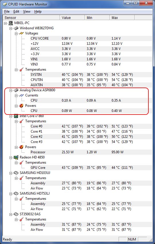 Hallo, wenn mich nicht alles täuscht gehört dieser Sensor zu deiner CPU. Bei den Core i 7 wird glaube ich auch die Leistungsaufnahme und der Stromverbrauch gemessen, so wie es in deinem Screenshot zu sehen ist. Außerdem geht schon aus dem Namen hervor (Analog Device) dass es entweder etwas mit einer Temperaturmessung und oder mit einer Verbrauchsmessung zusammenhängt. > In dem Fall mit der Verbrauchsmessung ( Watt)
