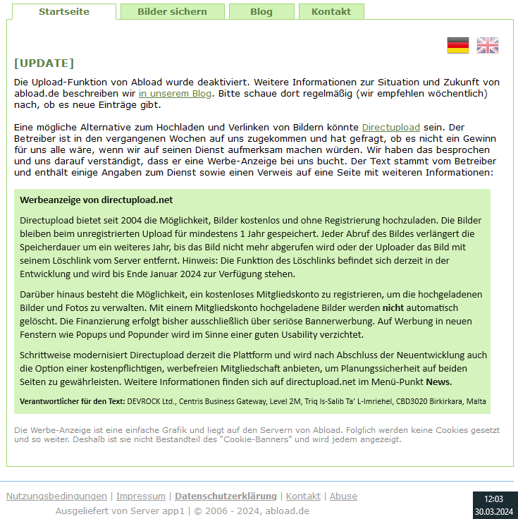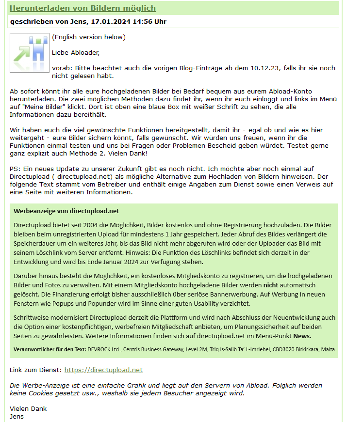 Situation leider unverändert, weiterhin nur die Empfehlung der Alternative, keine Upload-Funktion.Netvampire schrieb:abload empfielt ja zur zeit selbst directupload.net