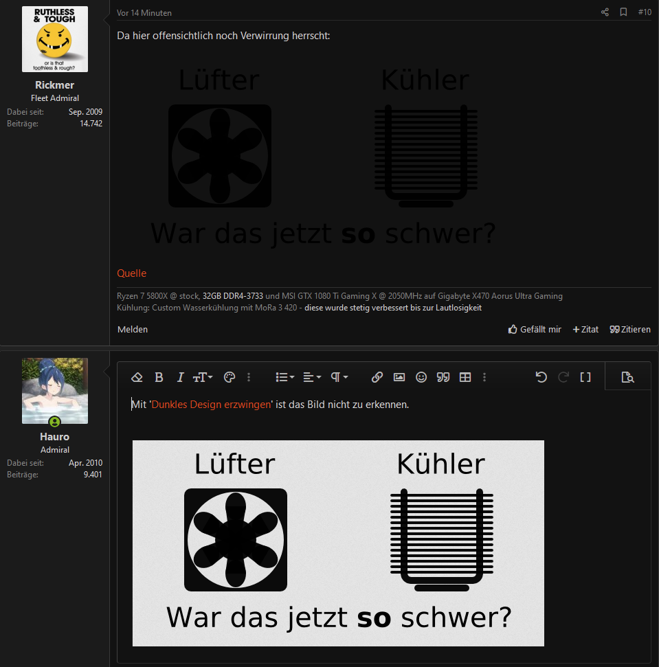 Vielleicht solle man hier auch erstmal erwähnen, dass ein Kühler und ein Lüfter zwei unterschiedliche Dinge sind. Der TE nimmt diese Unterscheidung sogar selbst vor.