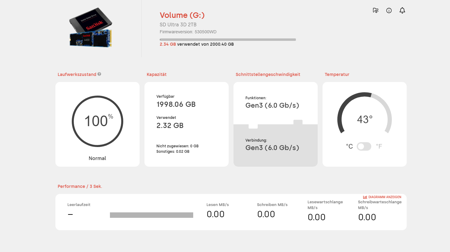 Beim Dashboard zeigt es mir an das die neue SSD 43 Grad beim offenen gehäuse hat , sie screens.