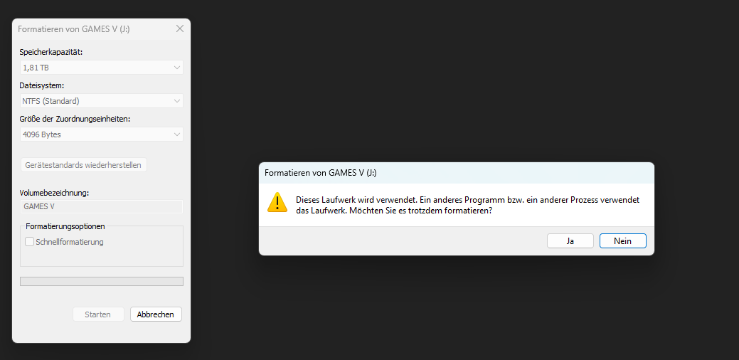 Habe das geändert und siehe da über die Datenträgerverwaltung konnte ich es dann schlussendlich formatieren.