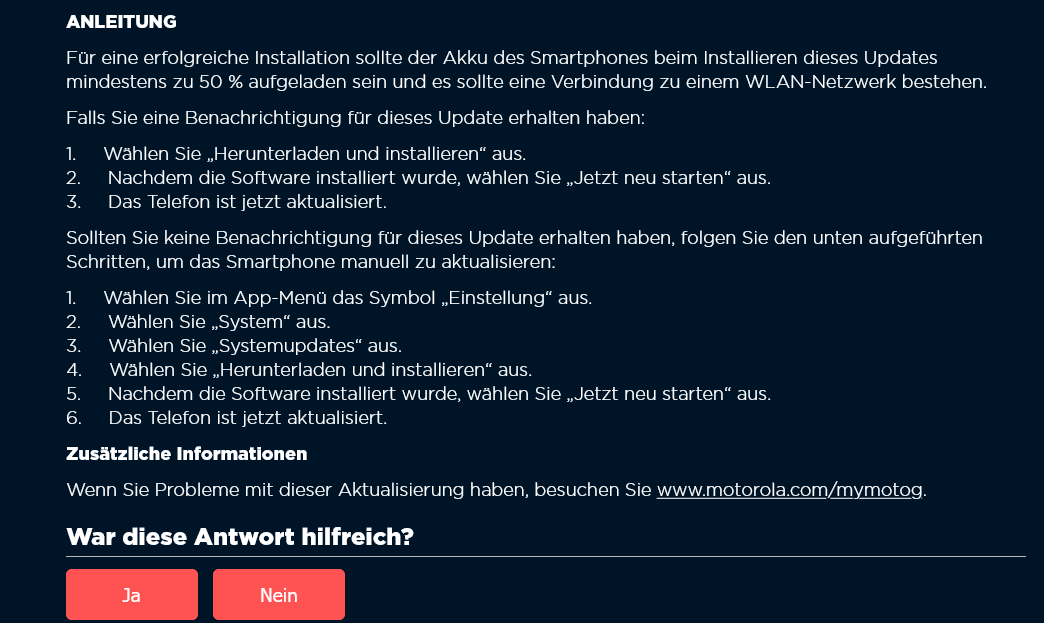 Habe noch den Hinweis vom Motorola Support bekommen, ich solle die Sim-Karte einlegen, das habe ich tatsächlich nicht gemacht. Naja, das Ganze läuft jedetzt schon seit 8 Uhr und ich habe bisher keine Updatebenachrichtigung bekommen.