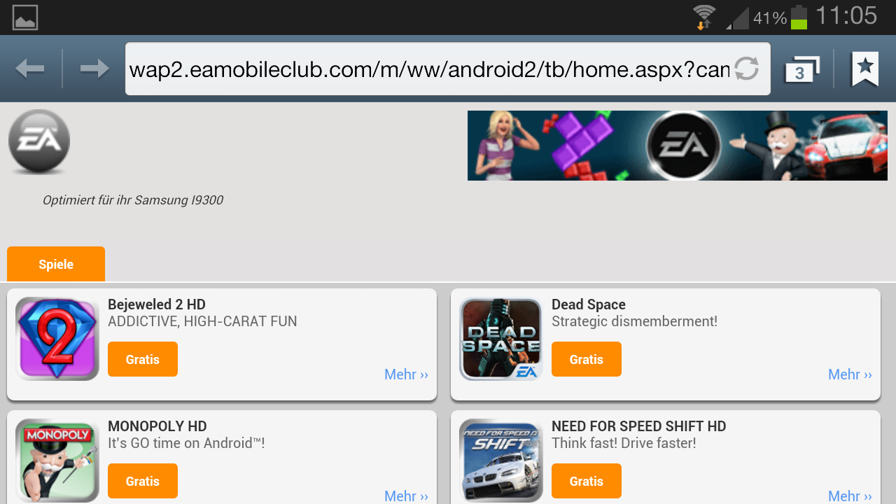 Das letzte Symbol war dann dieses EA-Zeichen. darauf geklickt, öffnet sich eine wap-Browser-Seite und namenhafte Spiele werden als Gratisspiele angeboten.