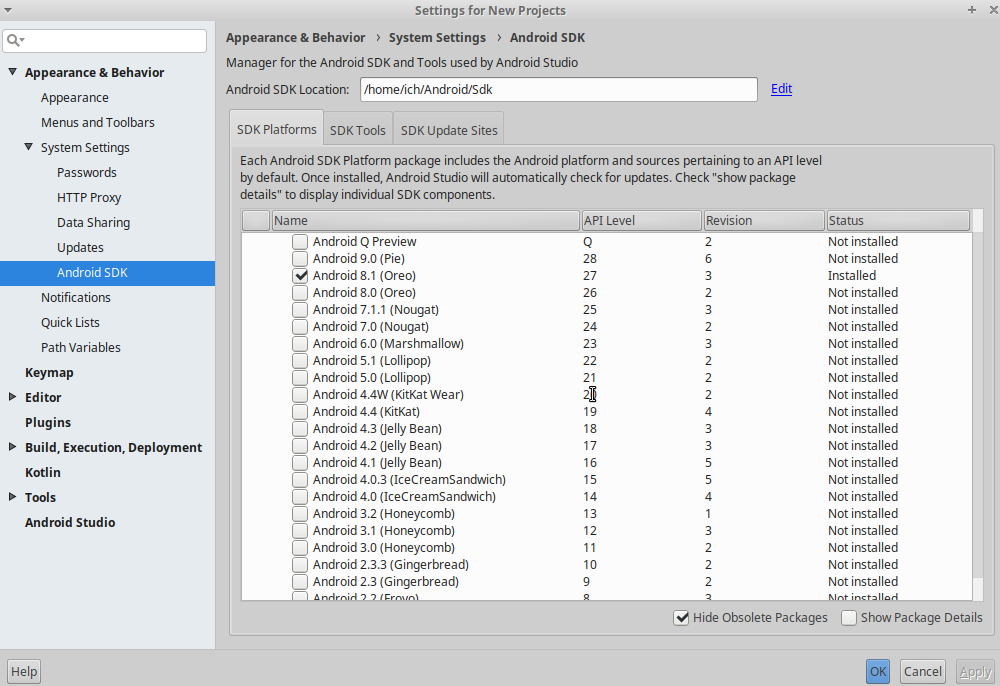 ich habe hier https://tutorials-raspberrypi.de/raspberry-pi-android-push-benachrichtigungen-bewegungsmelder/ eine Anleitung gefunden wie man von einem Raspbery Pi Push-Nachrichten bei bestimmten Ereignissen an ein Android-Smartphone schicken kann. Darin ist auf diese Anleitung von Android SDK https://staticfloat.de/allgemein/android-studio-einrichten/ verlinkt. Ich scheitere hier aber an Punkt 4 "Klicke „Launch Standalone SDK Manager“ - den Punkt gibt es schlicht nicht. Die Anleitung ist von 2017, hat sich da evtl. was an Android SDK geändert? Was muss ich auswählen um die dort beschriebene App erstellen zu können? Anbei ein Screenshot wie SDK bei mir aussieht.