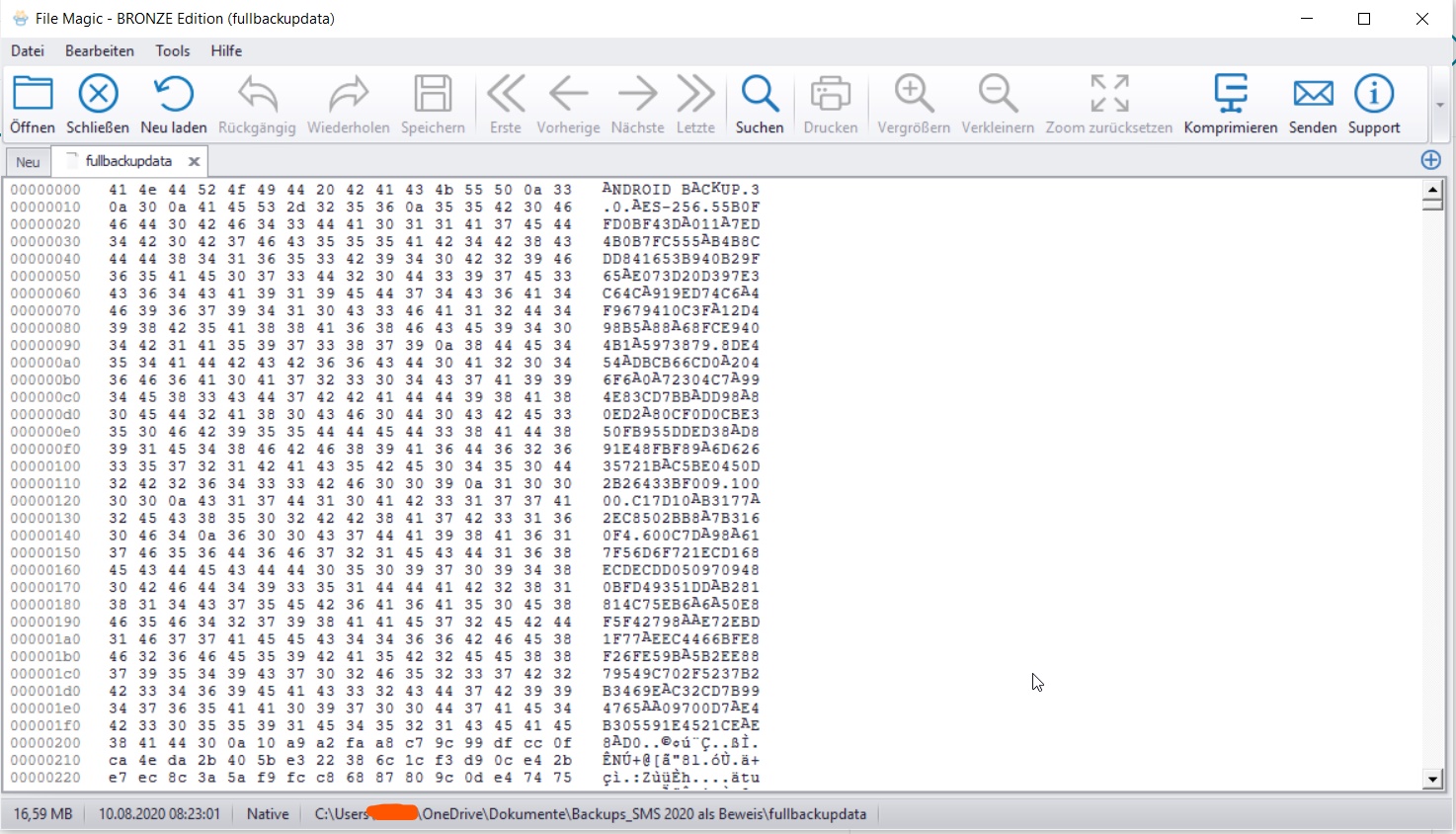Ich habe von einem defekten Sony Xperia (Typ weiß ich leider nicht, ist schon mehrere Jahre alt) alle SMS von einem bestimmten Kontakt mittels der Software "SMS Backup & Restore" in eine Datei namens "fullbackupdata" wiederhergestellt. Deren Dateityp konnte ich mit diversen Tools leider nicht herausfinden, ich konnte sie jedoch mit der extra dafür gekauften Software "FileMagic" öffnen. Allerdings bin ich absoluter Laie und die Software gibt nur "Kauderwelsch" aus, keine lesbaren SMS, siehe Anhang. Es handelt sich offensichtlich um die Daten im binären Modus? Kann mir jemand helfen bzw. sagen, wie ich die SMS lesbar und ausdruckbar wiederherstellen kann? Ich brauche sie wirklich sehr dringend als Beweise in einem anstehenden Gerichtsverfahren.