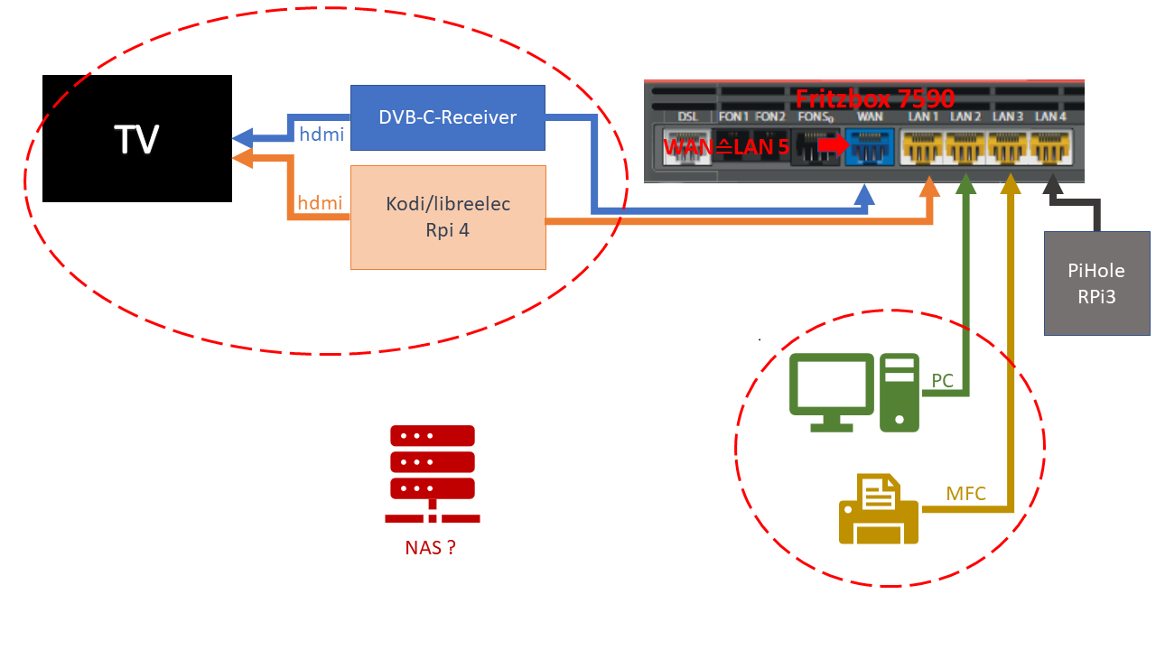 - FritzBox 7590 mit 5 LAN-Ports (und WLAN)