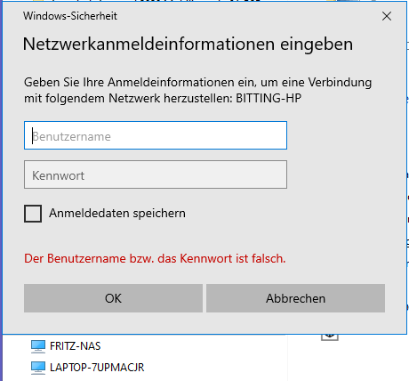Möchte ich nun auf die Rechner zugreifen, fragt mich Windows nach einem Benutzernamen und einem Passwort.