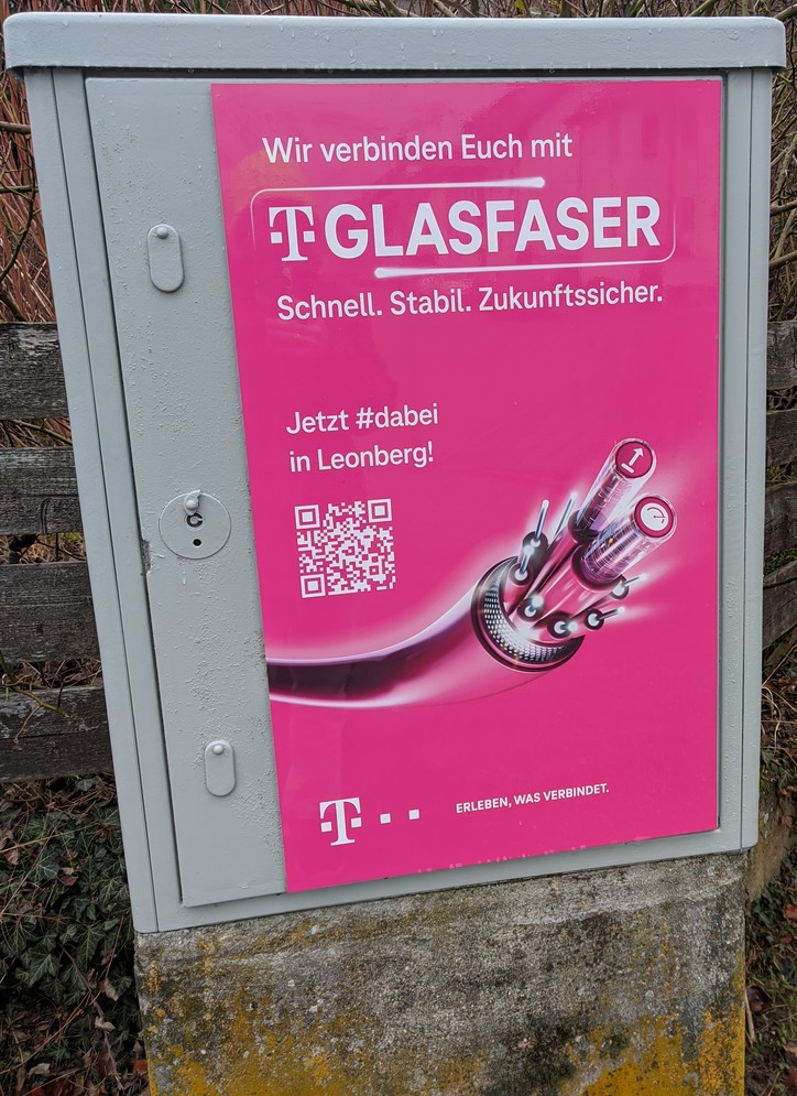 in 71229 Leonberg wurde teilweise schon Glasfaser ausgebaut, im OT Höfingen noch nicht. Seit einigen Tagen sind praktisch alle KVz im Ort mit Werbung für Glasfaser beklebt: