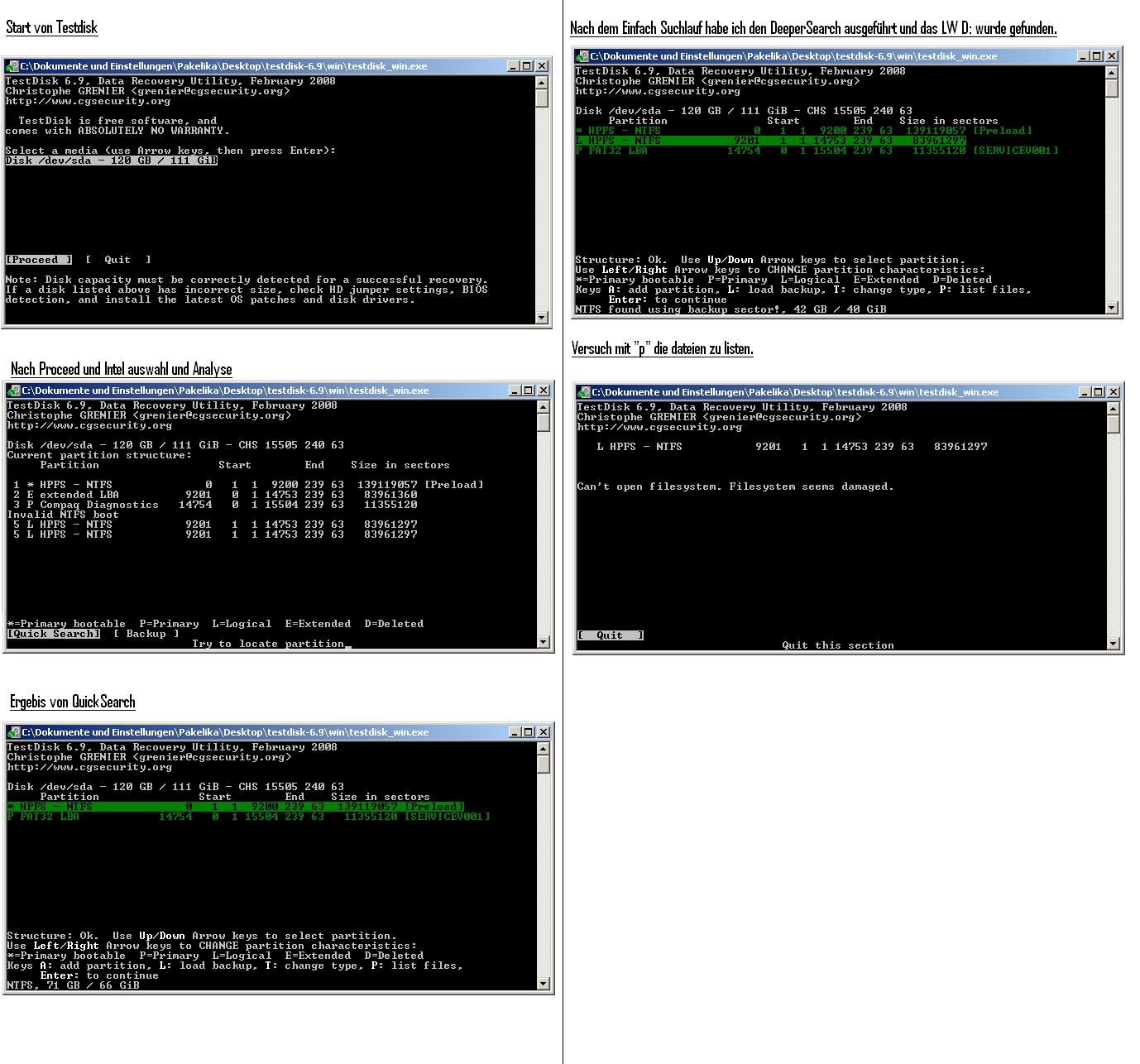ICh habe natürlich hier schon viels gelesen, und unteranderem auch TestDisk getestet, nur weis ich nicht mehr wie ich weiter verfahren soll, da fast alle probleme die ich hier gelesen habe sich mit der Ganzen festplatte beschäftig hatten, nicht mit einzelnen Paritionen.