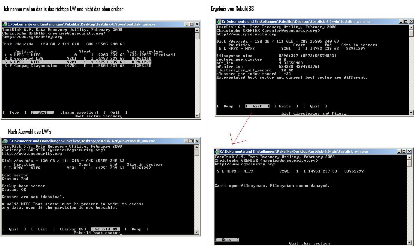 Ich hoffe das ich nicht die Lösung für mein Problem hier in dem Forum übersehen habe. Meistens wurde auf grund der Logs eine Lösung vorgeschlagen [ohja, da is der MBR kaputt du musst "das und das" machen] , da ich nicht viel ahnung von dem Aufbau von Dateisystemen habe und die Logs nicht interpretieren kann, will ich nicht einfach mal was ausprobieren, was anderen geholfen hat, da ich nicht weis inwiefern das jetzt nur eine Spezielle lösung für das jeweilige problem war.