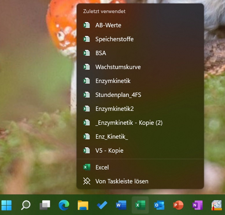 ich bin von Win10 auf Win11 umgestiegen und habe durchaus ein paar Vorteile für mich gefunden. Aber eine Sache vermisse ich sehr und ich weiß nicht, ob ich nur nicht finde, wie ich es aktiviere oder ob es unter Win11 nicht mehr geht: Ich hatte in Win10 u.a. meine Office-Programm wie Word, Excel & Co in der Taskleiste angepinnt und per Rechtsklick auf die jeweiligen Symbole konnte ich sowohl bewusst angepinnte Dateien oder auch die zuletzt genutzten Dateien im jeweiligen Programm sehen.
