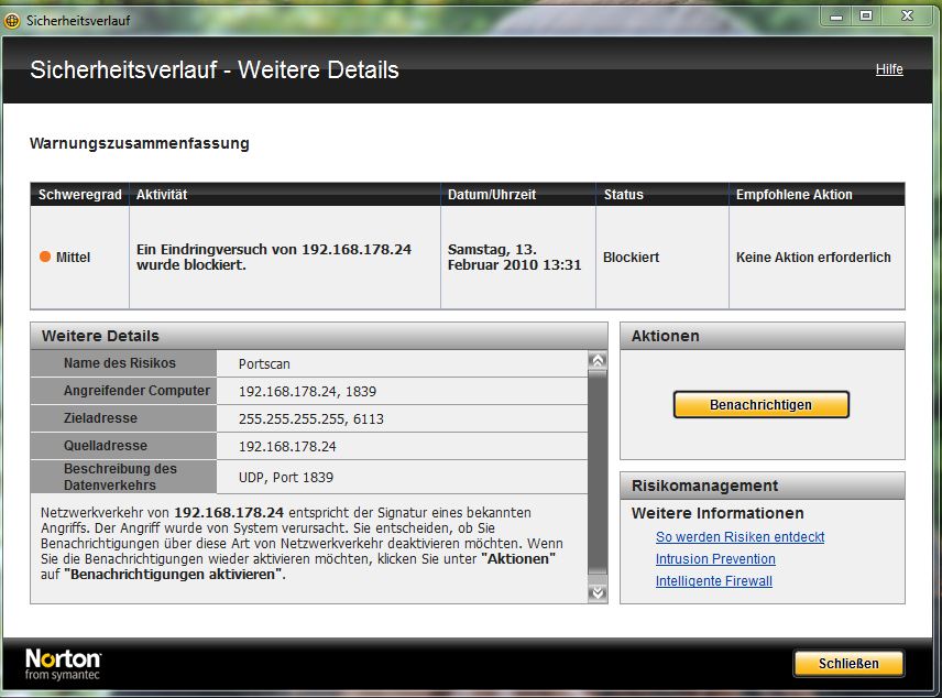 ich habe WIn 7 64 bit und habe zur zeit Norton 2010 Internet Security drauf. Ich habe seit ein paar Monaten Eindringversuche auf meinen PC, jeden Monat sind das so rund 300 Stück, diese werden alle immer von der selben ip druchgeführt. Muss ich jetzt Angst haben?Was kann ich dagegen machen?Ich habe in den Anhang mal ein Screen davon gestellt, wie Norton den Eindringslingsversuch auswertet. Hoffe ihr könnt mir helfen oder mir sagen,dass ich mir keine Sorgen machen brauch