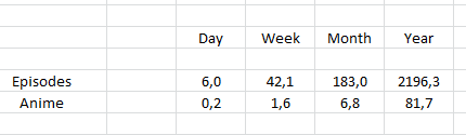 Je nach Saison 2-5 Folgen die Woche, und dann noch jeden Monat einen 2x bzw zwei 1x Folgen Animes ca.