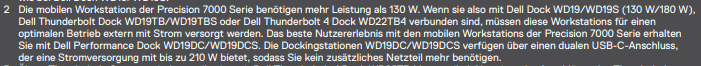 Könnte eventuell eine Vorgabe Seitens DELL sein. Ich habe auf der Arbeit ein Precision 7540 und da muss ich das 210W Dock haben, damit ich nicht noch ein extra Netzteil anschließen muss. Ist von DELL so vorgegeben in deren Kompatibilitätsliste.Drewkev schrieb:Es gibt durchaus welche die über 200W liefern können, da stellt sich mir dann aber die Frage wofür du so viel brauchst?