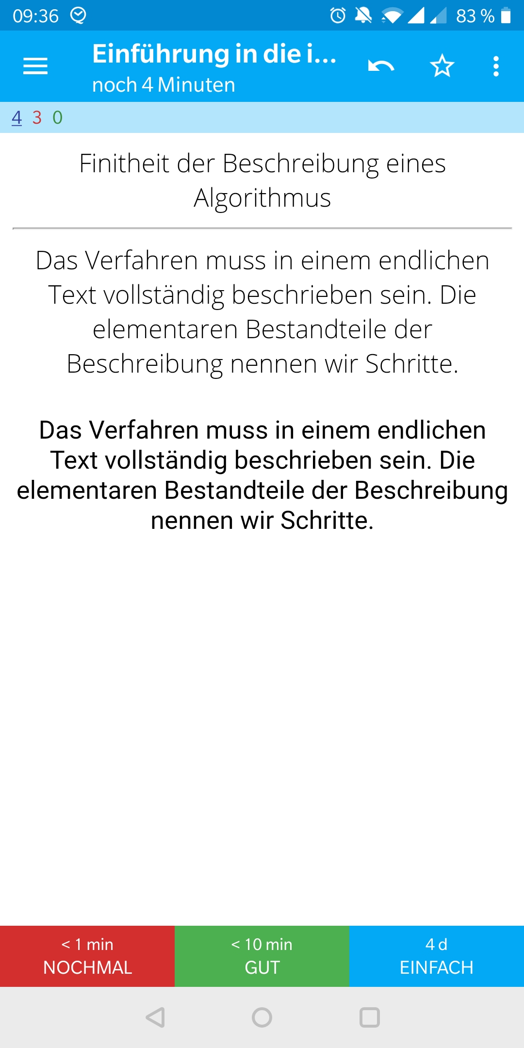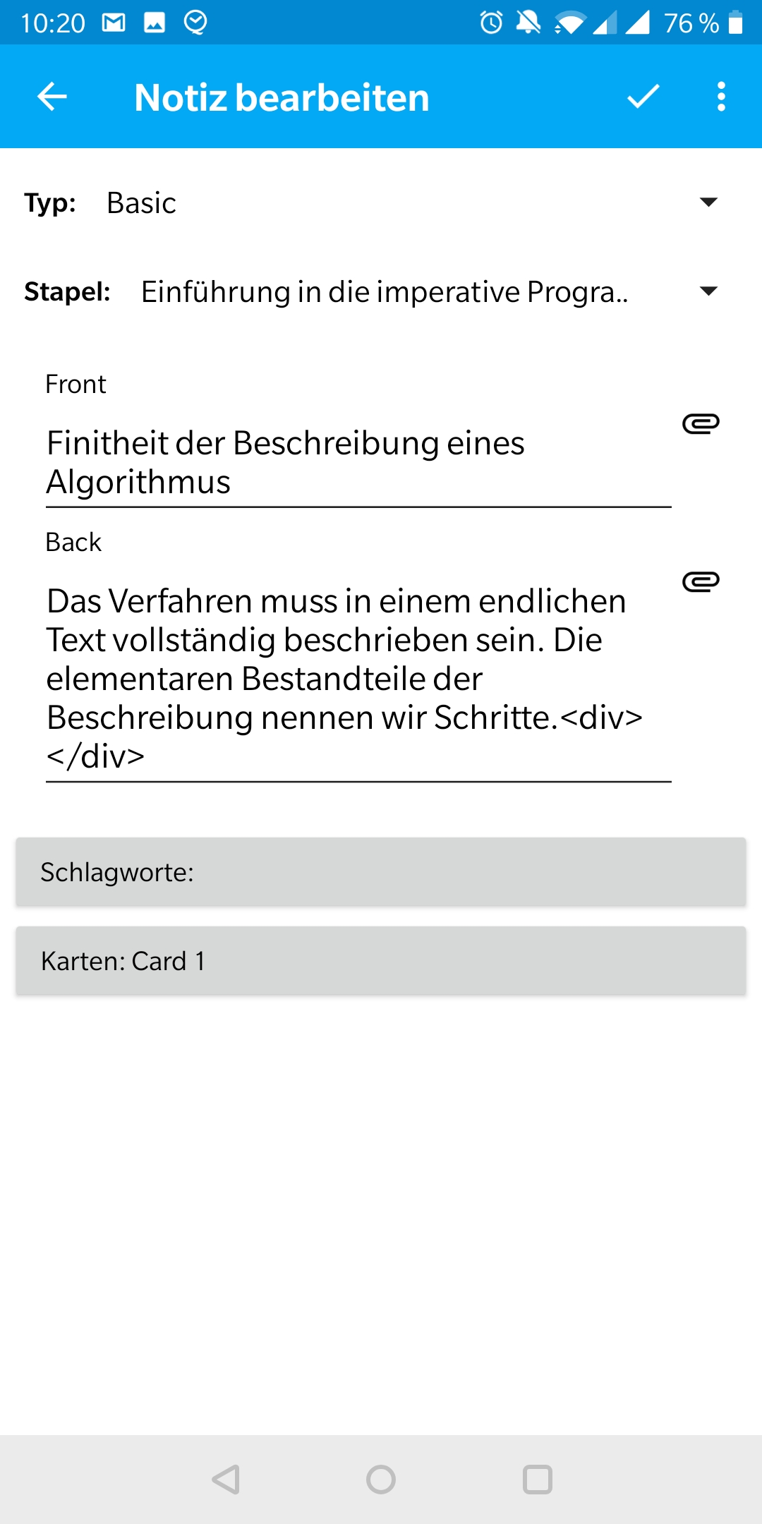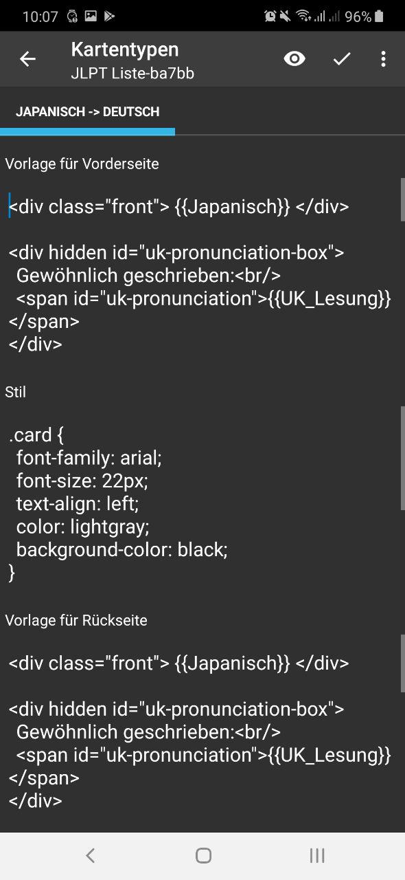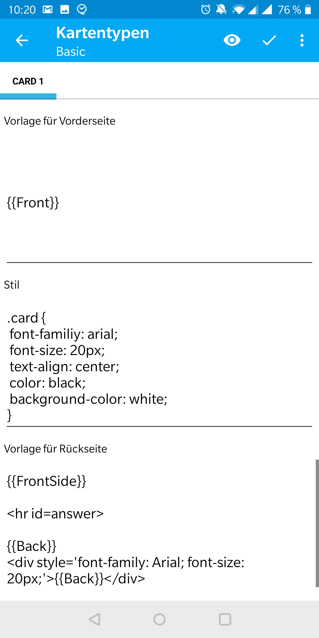 Bei Ankidroid habe ich mir neue Karten erstellt. Jetzt hab ich beim lernen das Problem, dass mir der Text auf der virtuellen Rückseite immer doppelt angezeigt wird (siehe Anhang). Das Problem tritt auch bei anderen Stapeln auf, muss also ne allgemeine Einstellung oder ein Fehler sein?