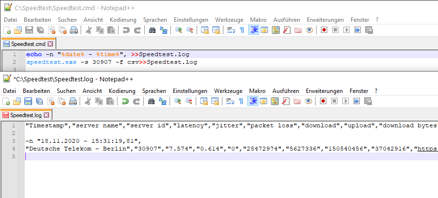Du machst also zwei Befehle/Zeilen: Zuerst das Datum rein, dann den Speedtest in die Datei schreiben lassen. So wie in #24, nur dass du eben ein wenig nach Windows übersetzen musst (fürs Datum vor allem, machst du ja schon).