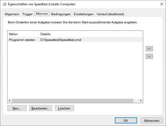 Code:D: cd Speedtest speedtest.exe -s ID -f csv>>Speedtest.logNun geht es an die Automatisierung: