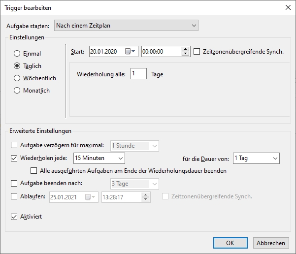 - Als Tag bitte den nächsten Tag angeben. Wenn heute der 25.01. ist, dann den 26.01. 00:00 Uhr als Startdatum wählen