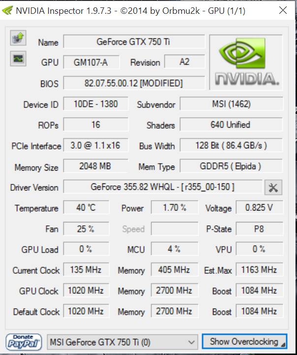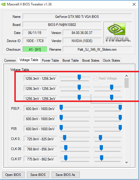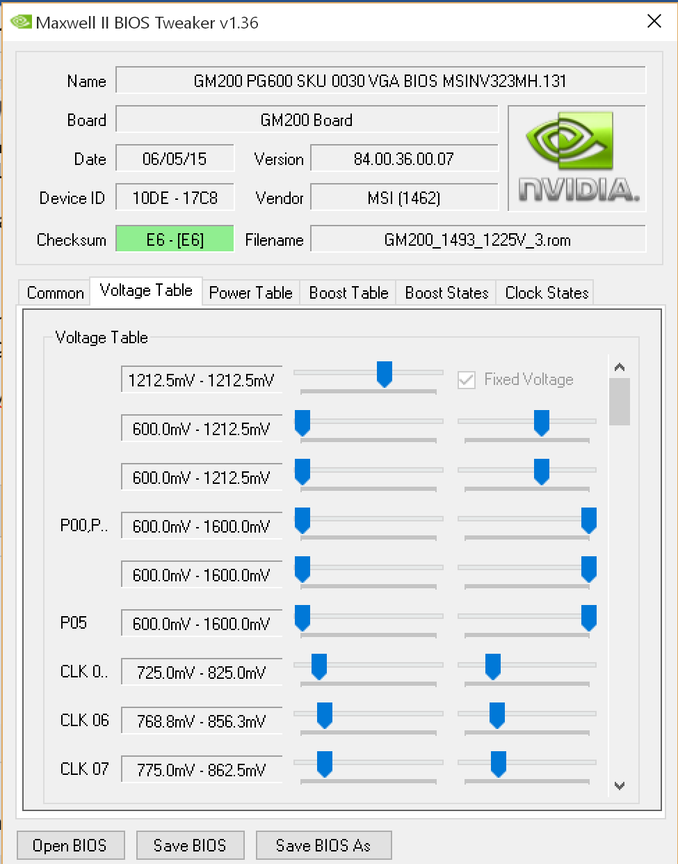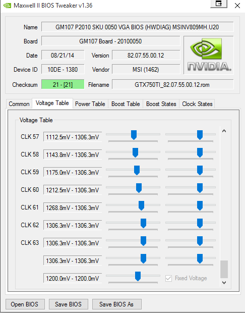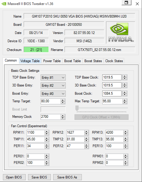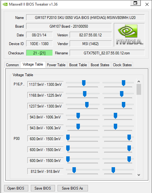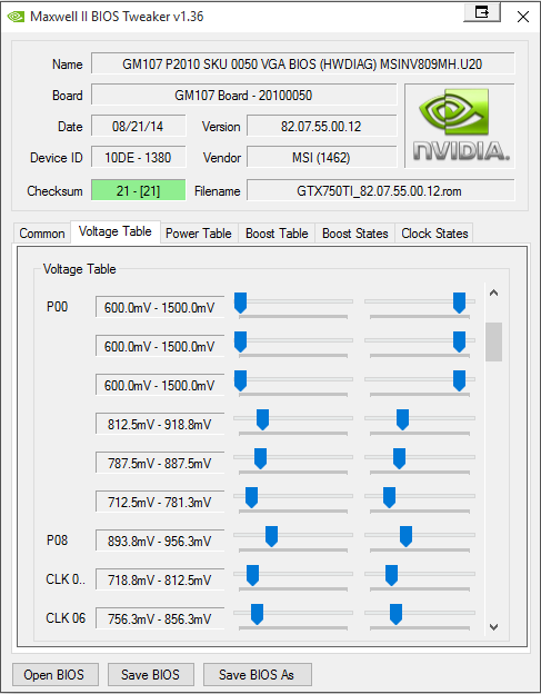 Ich hab eine Nvidia Geforce GTX 750 Ti (MSI N750Ti-2GD5TLP 2GB) und versuche gerade mit dem Maxwell II BIOS Tweaker v1.36 den Locok für die Mindestlüfterdrehzahl zu entfernen und die Grafikkarte zu Undervolten.