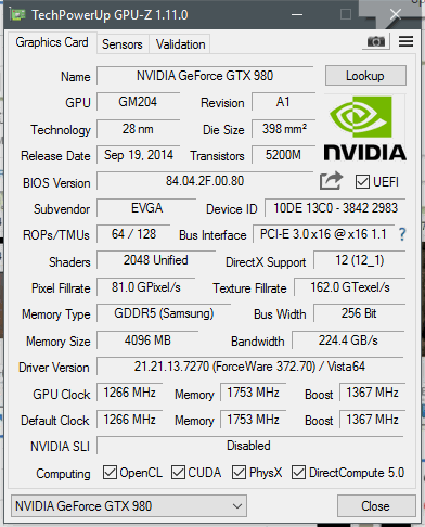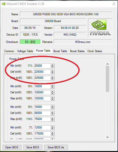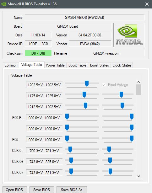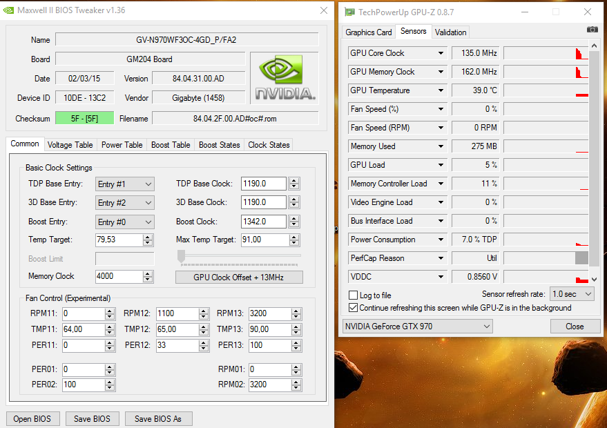 Voltage im BIOS auf 1281mV gestellt ergibt unter Last 1274mV. Dazu habe ich 375W eingetragen. Dies zusammen ergibt unter Last 1493MHz ohne was am Takt gemacht zu haben. Doch leider kommt es in F1 2016 interessanterweise zu Bildfehlern.