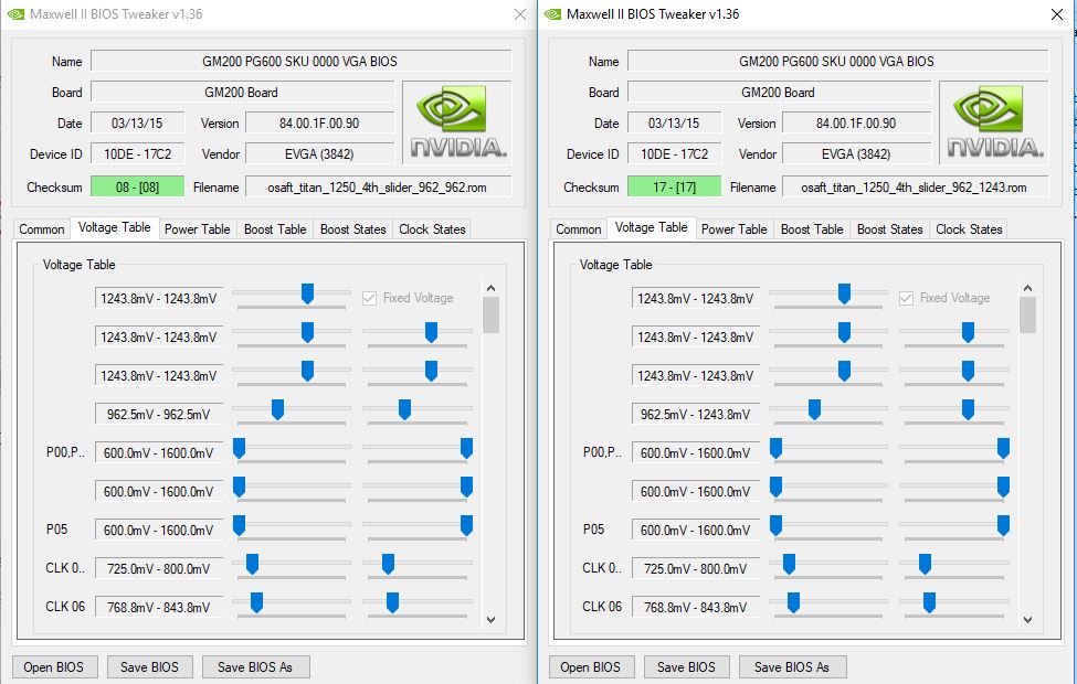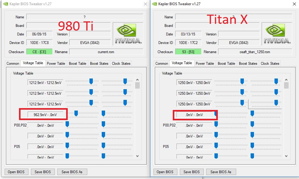See the difference? Die 980 Ti hat Stock schon 962 eingetragen wo die Titan nichts hat. Somit können wir damit mal testen. Einziger Haken ist, die Tools lassen mich kein Bios speichern bei dem die linke Splate auf 962 steht und rechts 0. Er Speichert es dann, aber irgendwie auch nicht, da es beim erneuten öffnen wieder auf 0 0 steht...