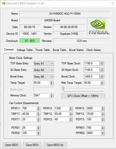 Nun besitze ich seit der ersten Stunde eine MSI GTX970, die so langsam in die Jahre kommt. Ich wusste zwar, dass solch Bios Tweaks gibt, hatte mich aber noch nie ran getraut. Nun hab ich diesen Thread hier gefunden und nun auch verstanden, wie simpel es doch eigentlich ist, das Bios anzupassen und zu flashen. Siehe da, ich brauch nun im Afterburner nicht mehr Hand anlegen. Hab ohne groß probieren die Spannung auf 1225mV festgesetzt (inklusive Boost usw), die Boost Spannungen angepasst, den RAM auf 3800mhz (4000mhz wären auch stabil) gesetzt und den Takt auf max 1506mhz eingestellt. Siehe da, es läuft auf Anhieb stabil, kein Absturz ingame, Temperatur um die 70°C. Vor diesem Eingriff lief die Karte bei mir ab Werk mit rund 1329mhz und beispielsweise 67°C in BF5. Einmal hab ich per Regler im Afterburner probiert, was das Maximum ist. Ohne was anzupassen, schaffte die Karte knapp 1560mhz. Vermutlich hab ich ein gutes Modell erwischt.