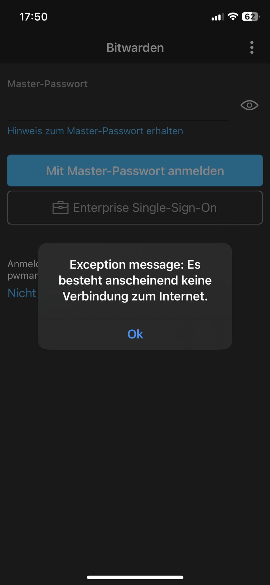 Die aktuelle Lösung um das Problem zu umgehen: Wireguard aktivieren. Sperrt sich die App nach Zeit x kann man sich wie gewohnt anmelden, ohne die Fehlermeldung bzw. Wireguard nutzen zu müssen. Total strange: selbige Fehlermeldung kommt auch auf wenn ein bestehender Eintrag angelegt oder geändert werden soll. Wireguard aktiviert und es funktioniert.