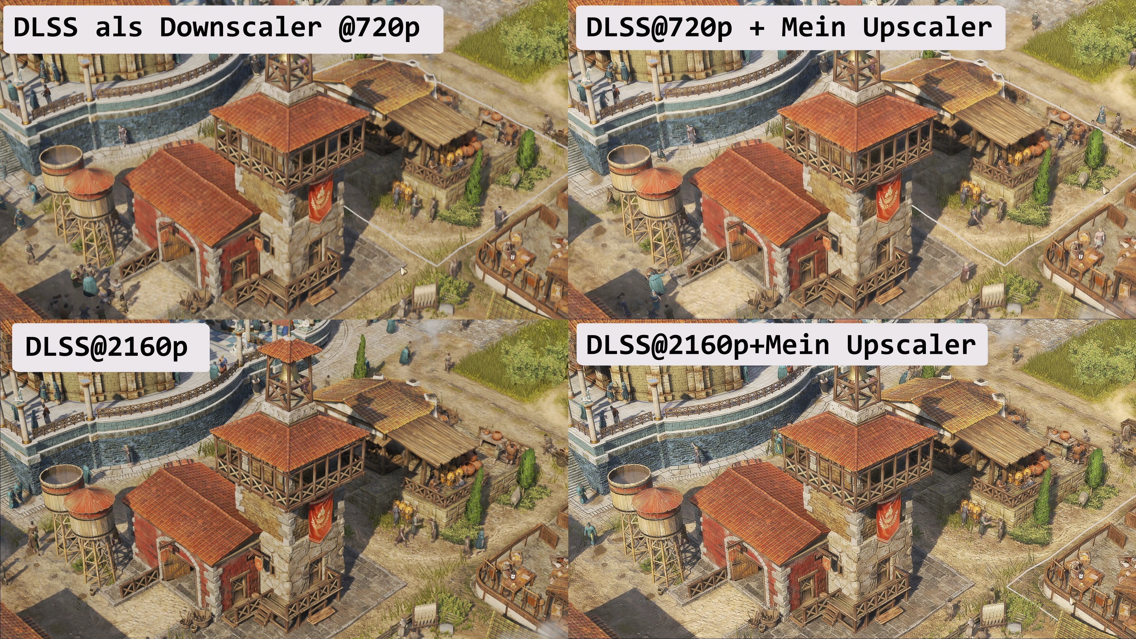 hier mal ein vergleichsbild im anhang dafür wurde bloom + andere effekte abgeschaltet, da wirkt mein upscaler jetzt wieder etwas zu scharf @ 2160p ... nuancen... LOL... dlss@720p sieht dann mit effekten und bloom völlig banane aus... kein bloom kein märchenhaftes anno ;D bloom ist nicht blur, die anno demo war mit halationeffekten völlig übersäuert xD hatte aber wenigstens den schärfe slider noch drin, ich brauche den zwar nicht, aber wer nicht fähig ist selbst zu graden, findet ja vllt die codezeilen für den schärfe slider aus der annodemo 🤣 und implementiert diese zeilen in die vollversion lol
