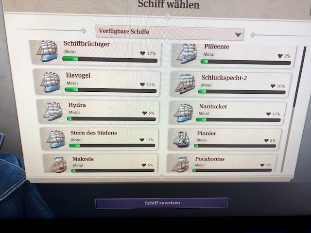 Die Moral eines Schiffes steigt mit den erfolgreichen/richtigen Entscheidungen auf Expeditionen und sinkt mit den falschen/fehlgeschlagenen.